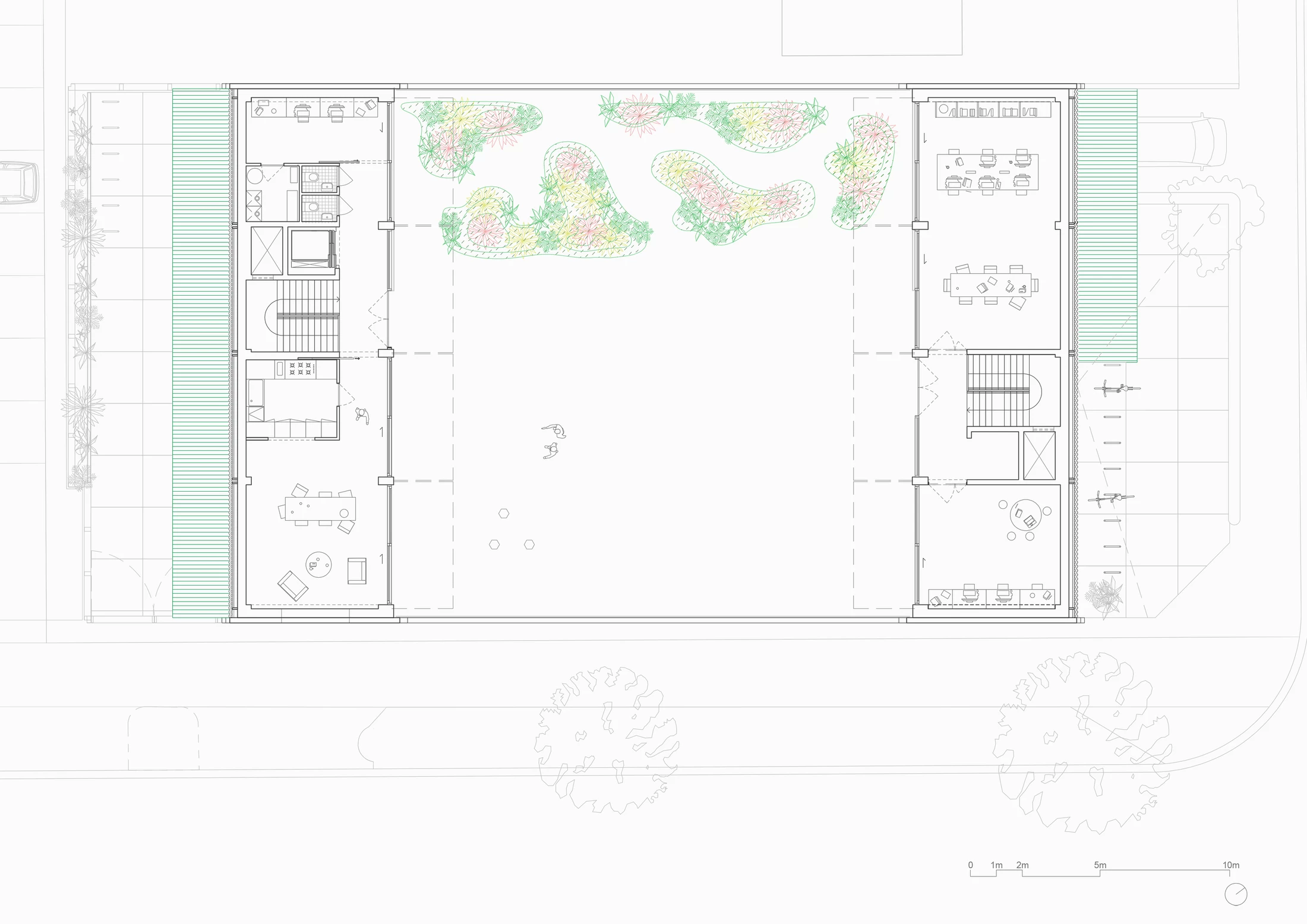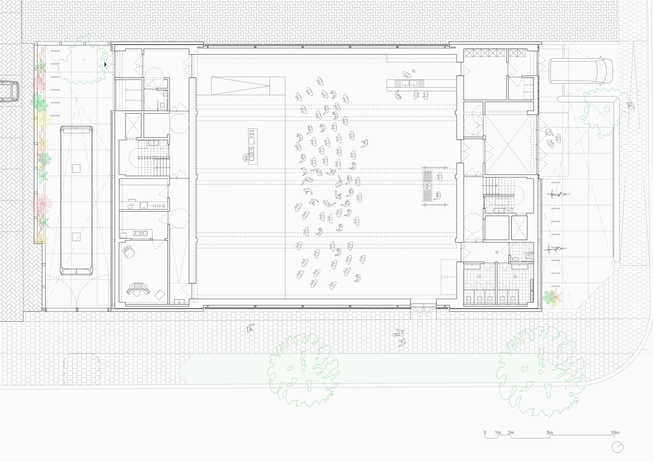 Aangezien het programma van het project in de loop van de tijd kan veranderen, moest er bijzondere aandacht worden besteed aan circulaire principes: aanpasbaarheid, flexibiliteit, omkeerbaarheid, en ook minimalisering van de koolstofvoetafdruk, met name bij de keuze van de materialen. Bovendien maakt het project deel uit van het Stadsvernieuwingscontract ‘Citroën-Vergote’. De ontwerper moest dus een co-creatieproces opzetten dat een proactieve deelname van de verschillende betrokken actoren mogelijk maakt: de Stad Brussel als toekomstige eigenaar van het nieuwe gebouw, de Maatschappij voor Stedelijke Inrichting (MSI) die de werkzaamheden leidt en de gebruiker van de zaal, de vzw Magasin 4.
