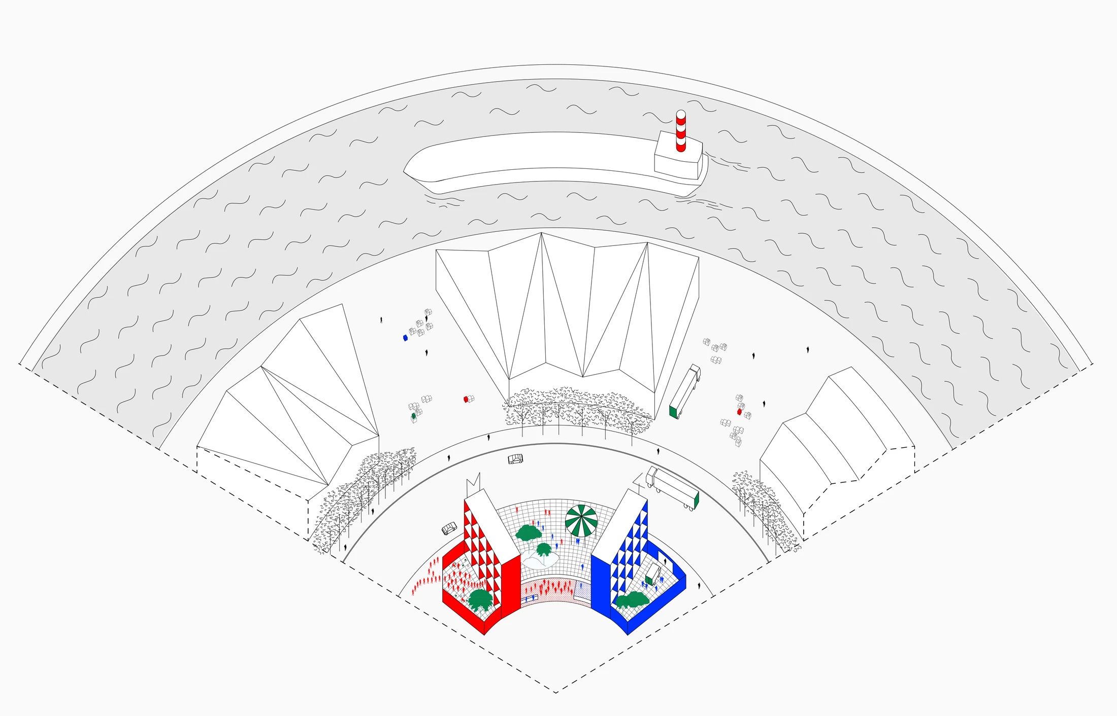 Door de vorm van het gebouw kunnen ook de circulatiekwesties worden aangepakt. De concertzaal wordt ingeplant langs de Havenlaan, met aan weerszijden onderling onafhankelijke verticale circulaties. Het ene been van de H is bestemd voor de circulatie van het publiek en het andere been voor de circulatie van de artiesten.