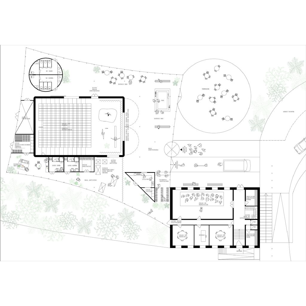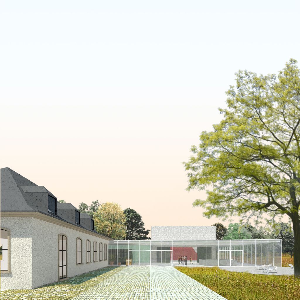 Het nieuwe volume waarin de polyvalente zaal en haar nevenfuncties zijn ondergebracht, bevindt zich achter het voormalige Vredegerecht. Aan de zuidkant, vanaf de straat, is de gevel perfect geïntegreerd dankzij de opmerkelijke bomen die het uitzicht en de volgorde van de lay-out filteren.