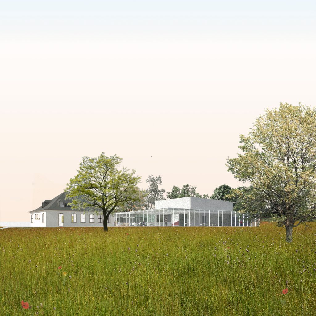 Aan de noordoostelijke kant opent het gebouw zich volledig naar de vallei, waardoor enerzijds de vlakte kan worden ontruimd en anderzijds een vrij uitzicht vanuit de foyer wordt geboden. De licht gebogen glazen gevel weerspiegelt op subtiele wijze de locatie en laat een fusie tussen architectuur en natuur toe.