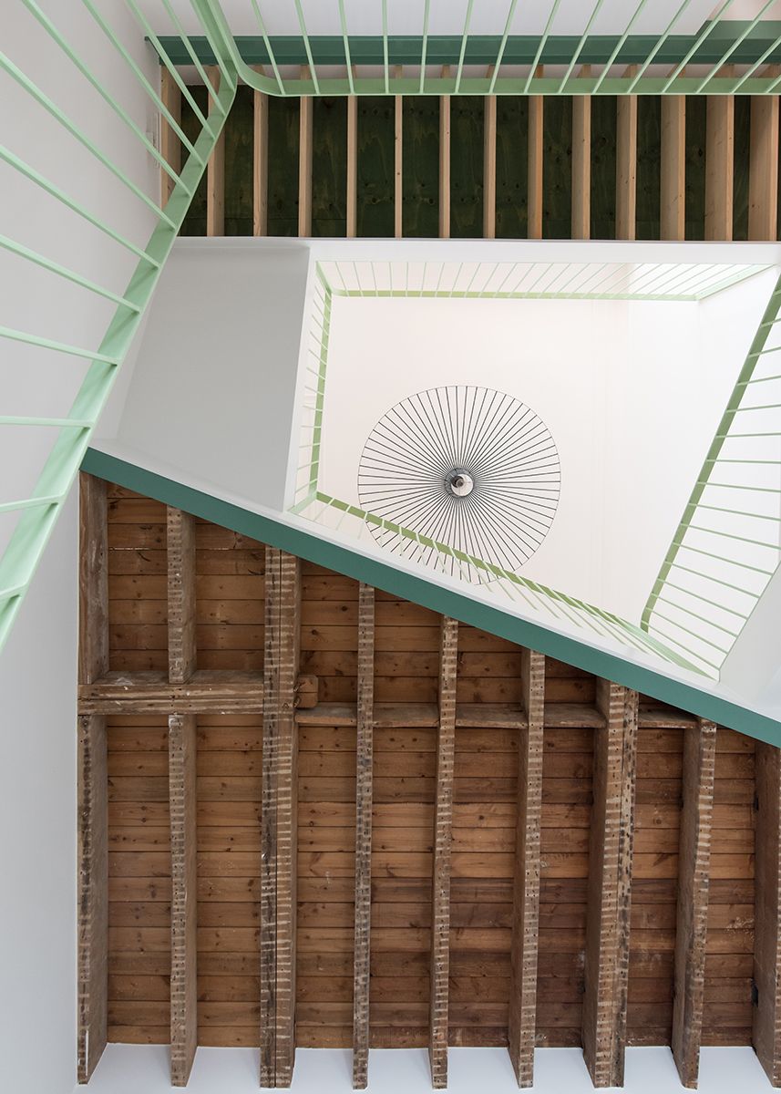 Die ruimtes zijn ook gedematerialiseerd en omgetoverd tot een prachtige half-level trap. Net als Victor Horta verbindt deze trap grote tussenverdiepingen, waardoor het mogelijk is om andere activiteiten te huisvesten dan alleen het passeren van de trap. Hierdoor wordt deze ruimte een echte leefruimte.
