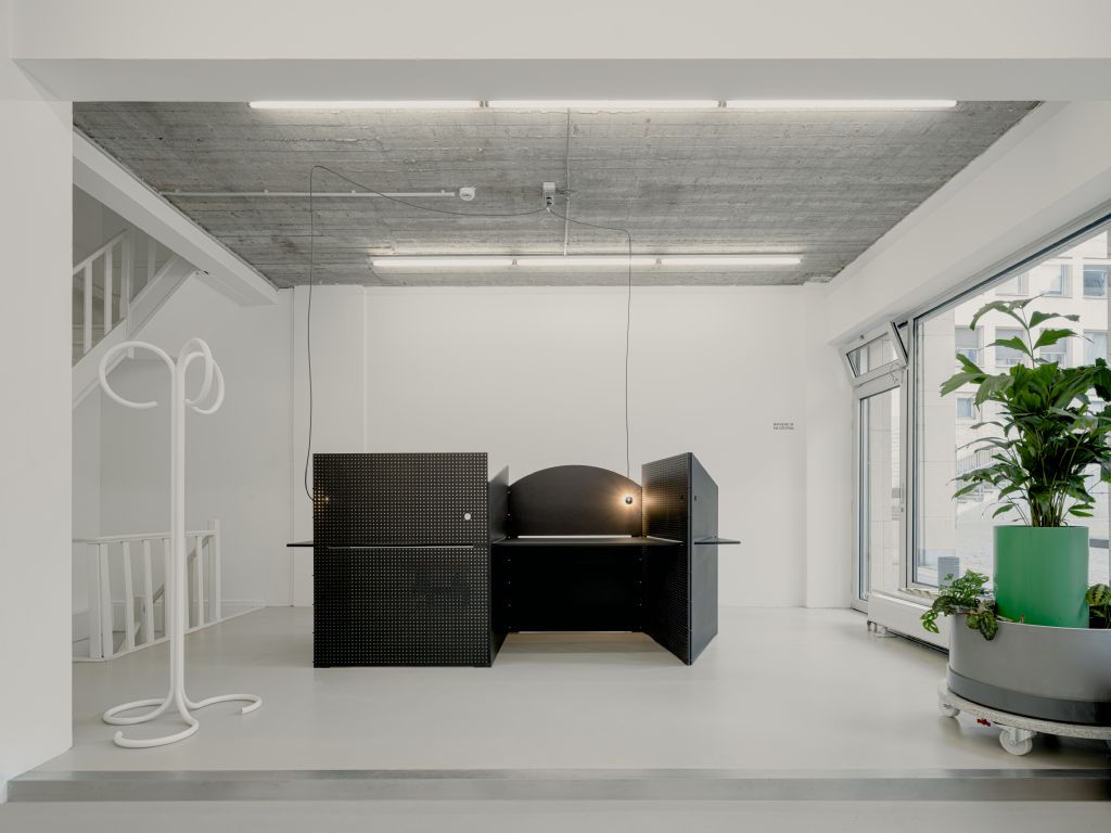 Aangezien SQ Central een coworking ruimte is, is de typologie van bureaus en tafels alomtegenwoordig. MANIERA selecteerde voor de galerieshow vier modellen. De eerste is Prototype 5 van OFFICE Kersten Geers David Van Severen, een aluminium versie van hun serie tafels voor MANIERA 01. Opgebouwd uit standaard commerciële componenten, zijn de frames gemaakt van industriële L-profielen. De structurele weerstand van de elementen heeft de afmetingen van het ultradunne tafelblad bepaald. De tweede, die ook in SQ Central wordt gebruikt, is de Leporello Desk van de Brusselse kunstenaar Richard Venlet i.c.w. Leander Venlet. Het bureau is een experiment met antraciet plaatmateriaal en een onderzoek naar de mogelijkheden om snel, eenvoudig en goedkoop autonome bureauruimten te creëren. Terwijl de verticale platen zowel als ruimteverdelers als structurele poten fungeren, biedt de horizontale plaat twee werkplekken. Om de vergankelijkheid van de structuur te benadrukken en de gebruikers de mogelijkheid te geven deze naar eigen wens opnieuw op te bouwen, houden zwarte wikkels de platen bijeen. De onregelmatige vormen van de panelen doen denken aan een skyline van een stad.