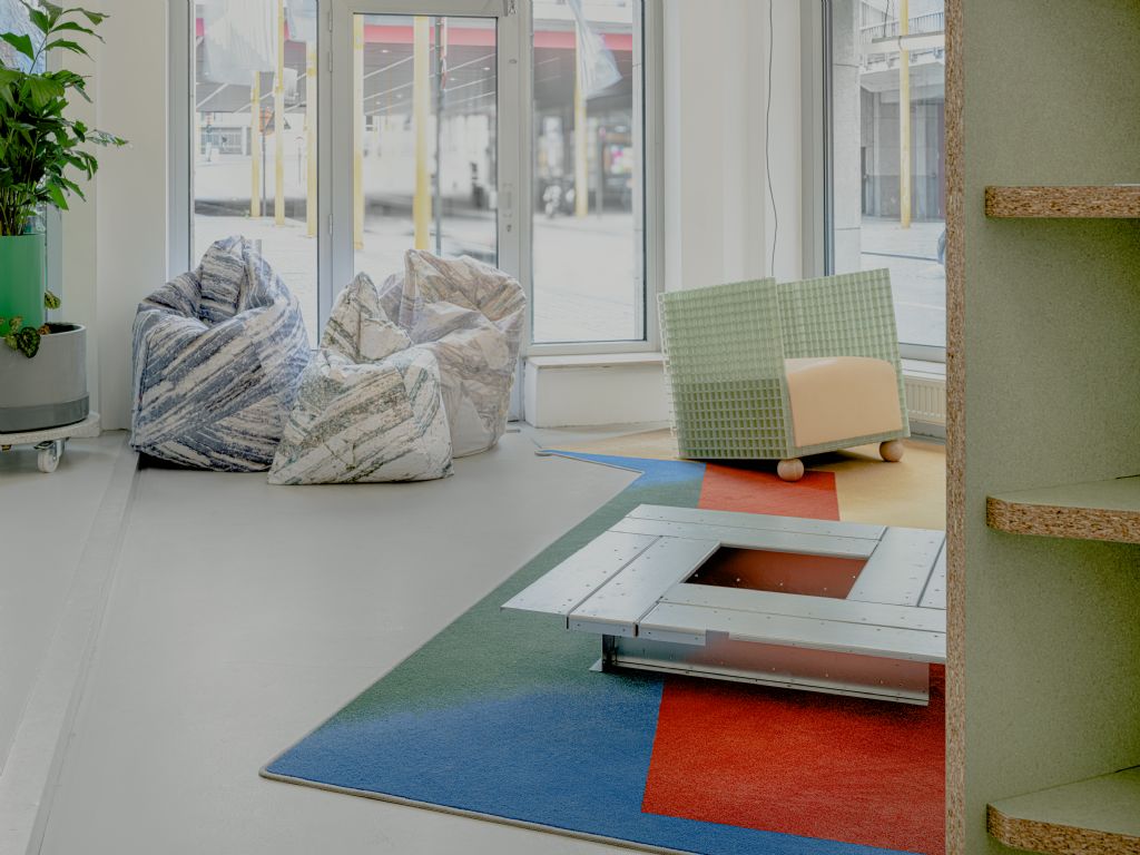 Speciaal voor SQ Central ontwierp de Brussels-Milaanse studio Piovenefabi de gebogen sofa S. CW. 2, die als pronkstuk fungeert in de hele coworking ruimte. De studio vermengt historische elementen - zoals de vormentaal van vrouwelijke ontwerpers uit de jaren dertig zoals Eileen Gray en Charlotte Perriand - met hun eigen streven om eenvoudige, grafische objecten te ontwerpen die evocatief genoeg zijn om de tand des tijds te doorstaan. Het Gentse bureau FELT Architecture & Design debuteert op MANIERA met zijn Fauteuil, die bestaat uit industriële doorschijnende glasvezelpanelen, een lederen kussen, een lamswollen deken en houten bollen. FELT tovert eenvoudige bouwmaterialen om tot speelse, maar geraffineerde meubels.