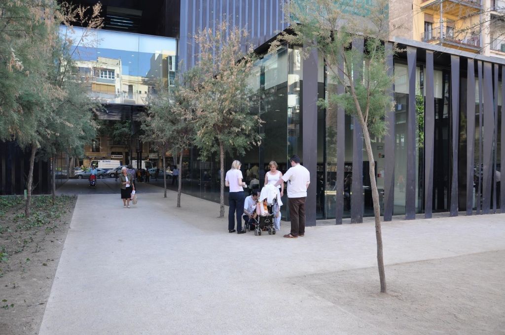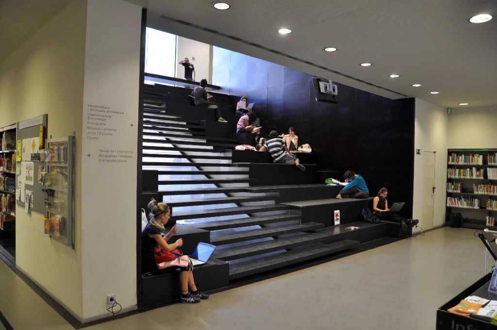 Het bouwprogramma omvat aan de straatzijde een bibliotheek en achteraan ruimtes voor samenkomst van de wijkbewoners, zowel in het interieur als op de binnenkoer. Met een grote beheersing werd dit binnen gebied vorm gegeven door eenvoudige materiaalkeuze, een zone van beplanting tot en met de verlichting en het zitmeubilair. De zitbanken voor het exterieur zijn door RCR Arquitectes ontworpen en worden hernomen, in een andere materiaaluitvoering, in het interieur van de bibliotheek.