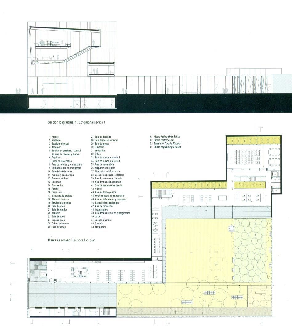 De tekening van de doorsnede is de sleutel om het project te begrijpen en is ook de essentie van het ruimtelijk concept voor de voorbouw, het gedeelte van de bibliotheek. De doorgang is meer dan een hoge ruimte. Vanaf de straat is er ook een doorzicht tussen de tweede en de vierde bouwlaag, een onverwacht visuele oplossing die ook vanuit het interieur wordt benut om de band tussen straat en de semipublieke zone op een niet traditionele wijze te herdefiniëren. Het effect op openheid wordt nog versterkt door de weerkaatsing die ontstaat door het glanzend zwart oppervlak van de metalen plafondbekleding van de doorgang. Er ontstaat een royaal gebaar om de mensen uit te nodigen.