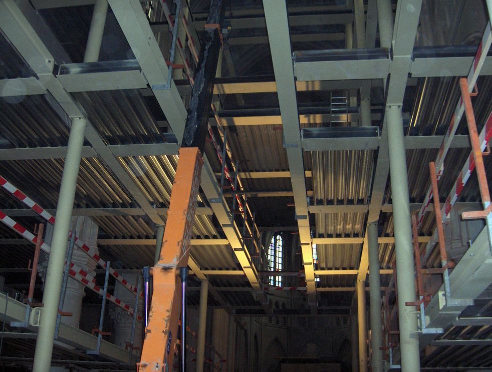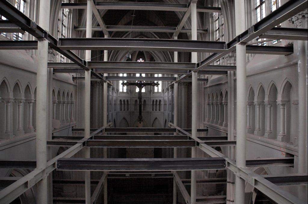 Jonckers: Er werden in totaal 5 extra bovengrondse vloerplaten toegevoegd. Binnen het bestaand volume van de kerk konden we zo 56 kamers huisvesten samen met conferentieruimtes op het gelijkvloers.