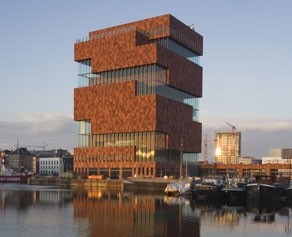 Het MAS bestaat intrinsiek uit betonnen blokken die - met de nodige inspringing - op elkaar gestapeld zijn. Deze werden bekleed met panelen van gekloven Indische hardsteen, die het gebouw z’n robuuste uitstraling geven. In totaal werden er vier verschillende tinten van het materiaal gebruikt (van oranje rood tot middenbruin), die op basis van een computergestuurd patroon over de gevel werden verdeeld. Dit resulteerde in intrigerende kleurschakeringen. De keuze voor de Indische hardsteen werd ook doorgetrokken in het interieur en het plein voor het MAS.