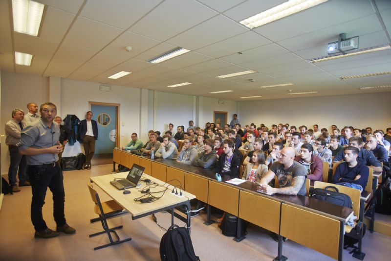 In een uiteenzettig van een uur deelt BIM-manager Nic Maes zijn knowhow met de studenten. Vertrekken doet hij vanuit de filosofie van Mathieu Gijbels die luidt dat bouwen teamwork is. Nic Maes: “Met BIM stop je alle informatie in één computermodel en bouw je als het ware tweemaal: een eerste maal virtueel en een tweede maal op de werf. Fouten op de werf worden zo tot een minimum herleid. Zodoende draagt BIM veel bij aan een goede verstandhouding tussen bouwheer, aannemer en architect.”