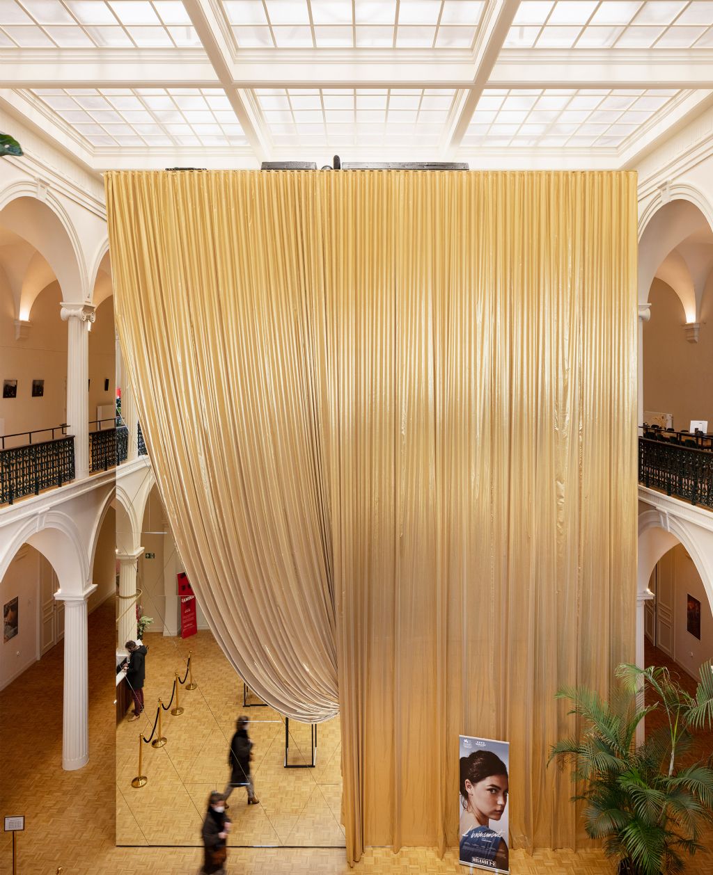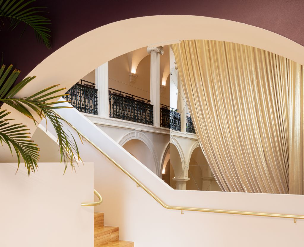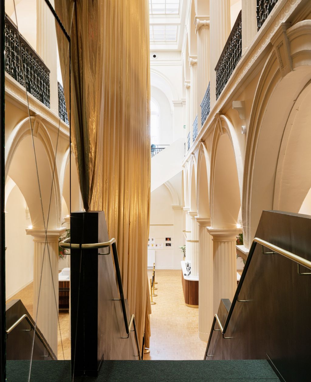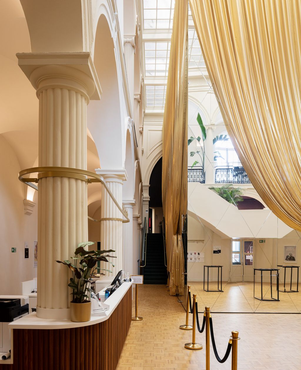 “Het draperen van een gouden gordijn omheen deze toren geeft deze een rankere verschijning en een verzachtende tactiliteit, zacht wiegend in de ruimte. Het slim toepassen van spiegels op de toren geeft de bezoeker verrassende doorzichten binnen het prachtige gebouw”, aldus het ontwerpteam. De toren is alzo een akoestisch intimistische box, met eromheen een genereuze ode aan de oude feestzaal, eten, drinken en ontmoeten.