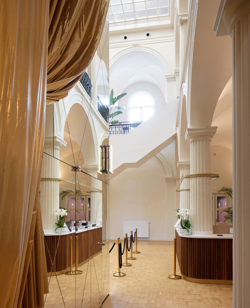 De vestibule bleef behouden als inkomruimte en belangrijke verticale circulatie. Een nieuwe trappartij verbindt de vestibule met de feestzaal en verknoopt de foyer, de toren en de omliggende gaanderijen in één vloeiende beweging met elkaar.