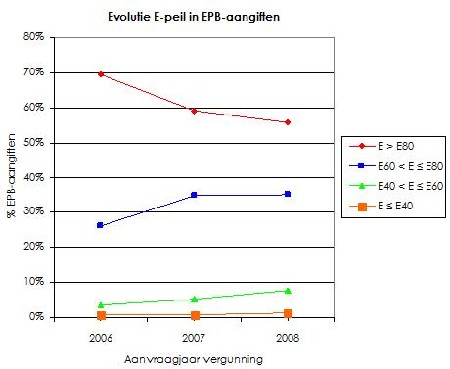 Vier jaar na de invoering van de energieprestatieregelgeving in Vlaanderen, kan worden vastgesteld dat nieuwe woongebouwen veel betere energieprestaties behalen. Hun E-peil (energieprestatiepeil) is sterk verbeterd. Volgens de regelgeving mocht de voorbije jaren maximaal E100 worden gebouwd. In de praktijk is gemiddeld 20% energiezuiniger gebouwd dan de eis. Het gemiddelde E-peil is voor een vergunningsaanvraag van 2006, 2007 en 2008, gedaald van respectievelijk E86, tot E82 en verder naar E80. Al ruim 4 nieuwbouwwoningen op 10 voldoen aan de lagere E-peileis E80 die vanaf 2010 voor woongebouwen van kracht is.