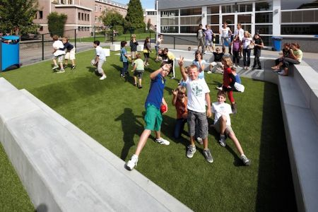 Landschapsarchitect Frank Caers vertrok voor zijn ontwerp van een openluchttheaterklas in het scholencomplex ‘Voorzienigheid’ in Diest van een sprekende foto van een Afrikaanse leraar. Op de foto zie je een leraar die les geeft aan een groep kinderen die rond hem neerhurken in de schaduw van een boom. Het theaterklasje bestaat uit een lichtjes hellend vlak omgeven door een betonnen structuur, volledig op maat uitgevoerd in Megasmooth. “Een multifunctionele ruimte waarin je les of een voordracht kan geven, toneelvoorstellingen kan organiseren en waar je kunt spelen of gewoon wat rondhangen.”