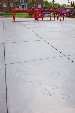De Nederlandse ontwerpster Karin Peulen betrekt vaak de natuur en organische materialen in haar werk. Voor het Pocket Park in Heerlen ontwierp ze een betonnen grootformaattegel met bladmotief. “Het is een compositie van bladeren van bomen die hier in het parkje staan. Door de golfbeweging lijkt het net of ze wegwaaien. Wanneer er echte bladeren op vallen, worden de tegels helemaal één met de natuur. Ik hou van beton. Het is één van de meest pure en mooie materialen om mee te werken.”