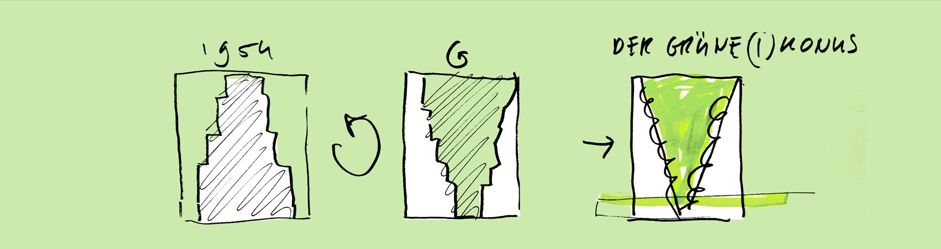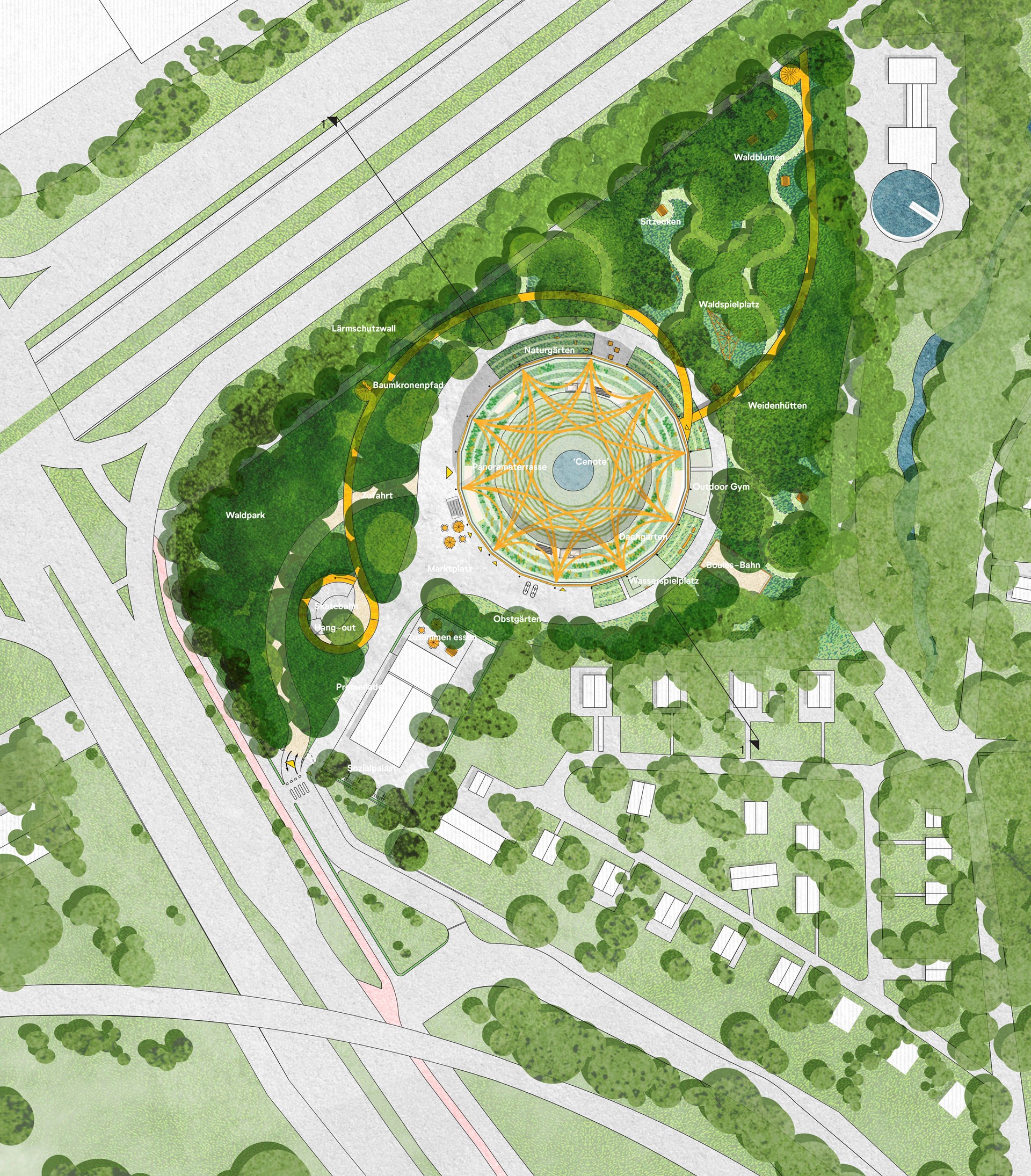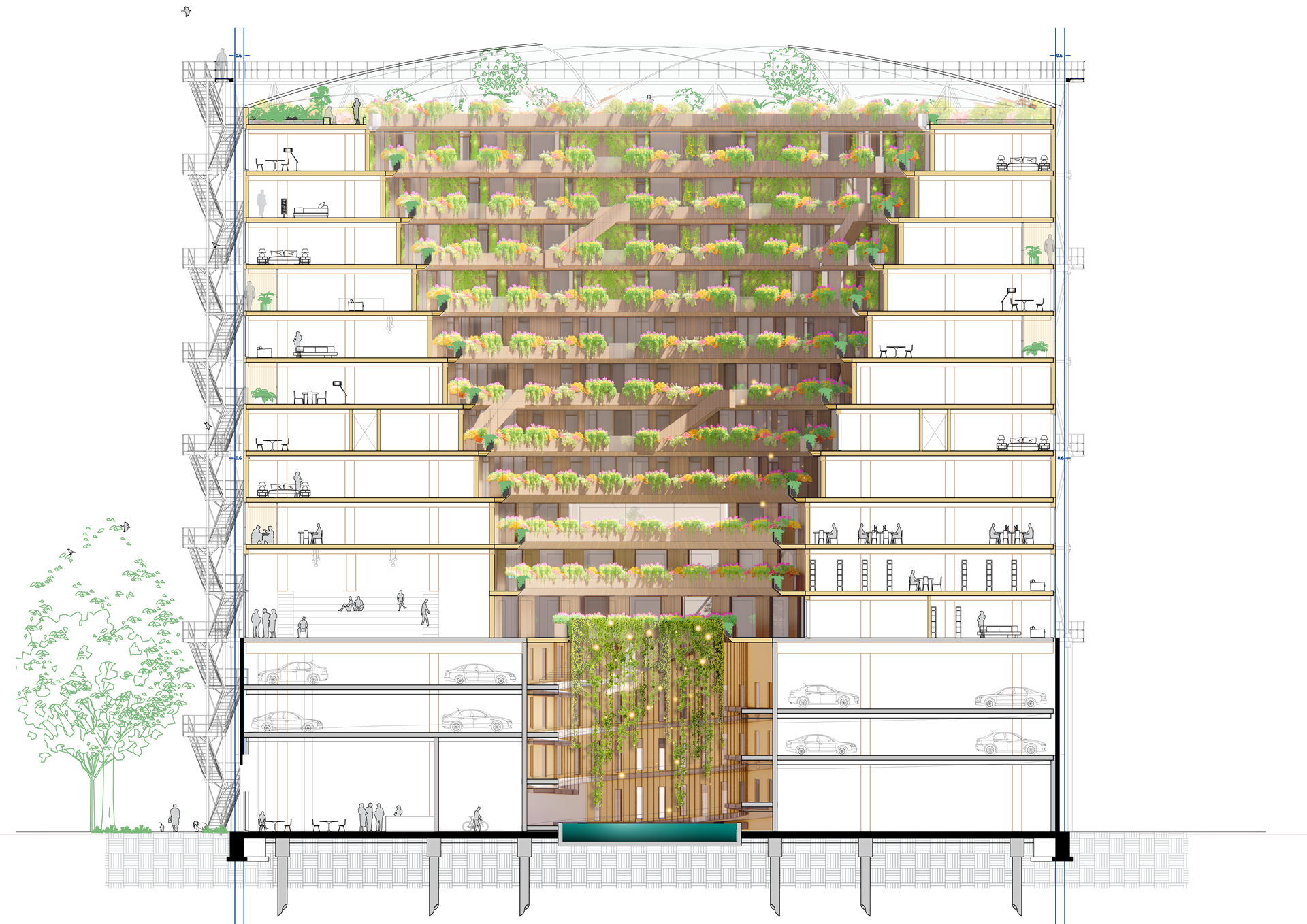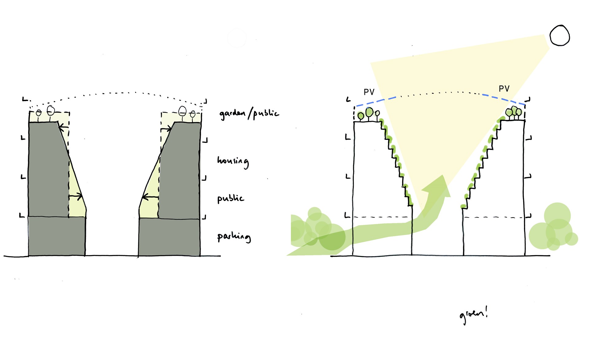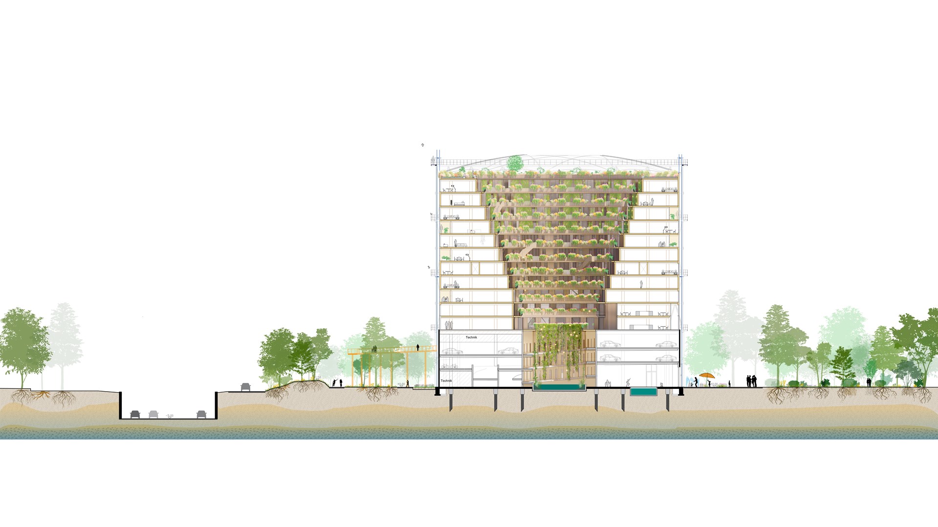In de sokkel, het van origine relatief gesloten deel van het gebouw, wordt een mobiliteitshub gerealiseerd met parkeergarage, fietsenstalling, fietscafé, in combinatie met een publiek zwembad. In het gedeelte erboven worden in meerdere lagen diverse publieke voorzieningen geprogrammeerd, zoals een theater, co-working ruimten, commerciële ruimtes een gezondheidscentrum. Vanaf het maaiveld wordt middels een luchtbrug een uitnodigende voetgangersroute toegevoegd, die de bezoekers door de kruinen van de bomen in het omliggende park naar de publieke functies leidt en waardoor een verhoogde, levendige plint ontstaat.