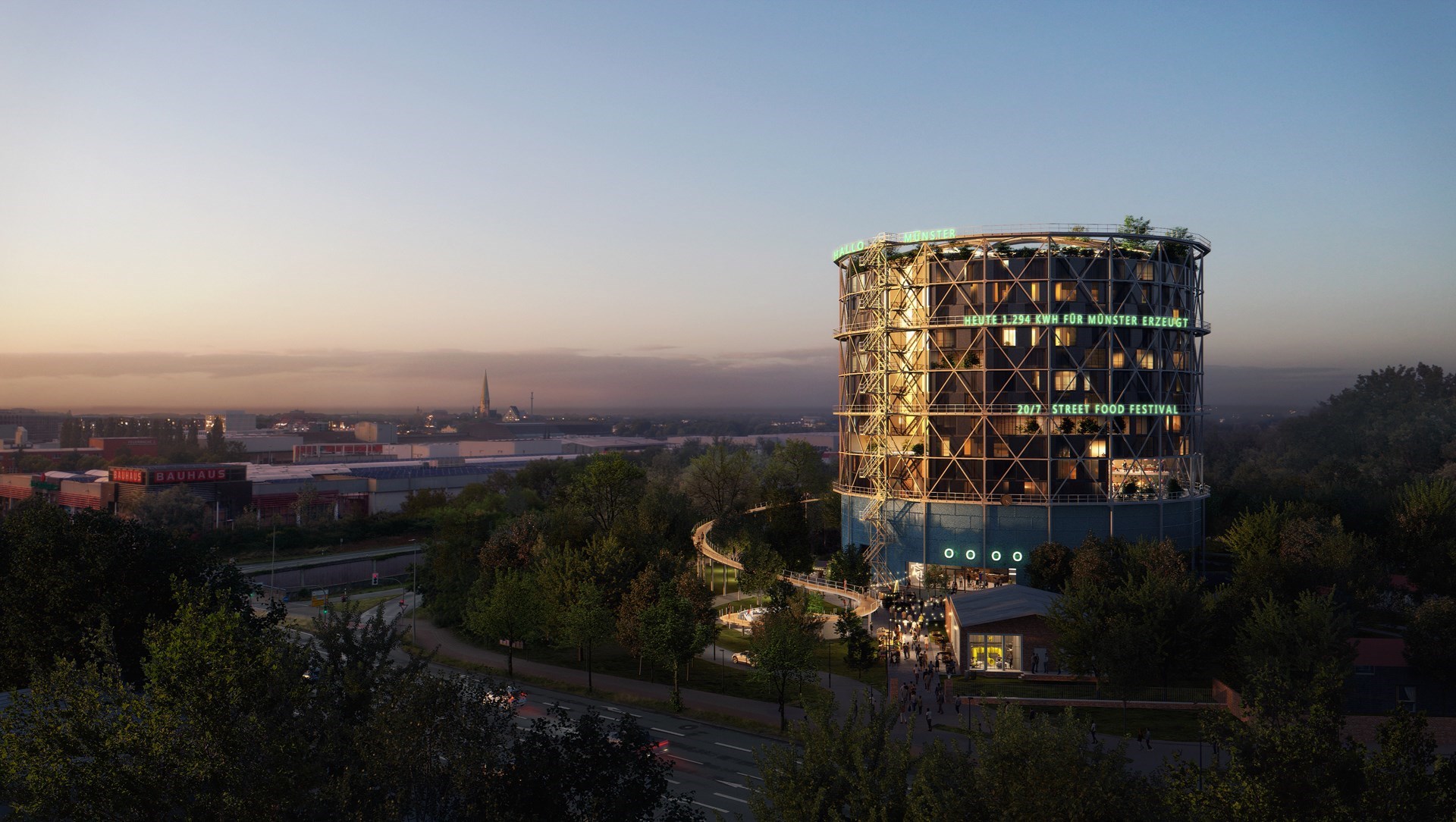 Mei architects and planners (NL) herbestemt iconische Gasometer Münster tot natuurinclusieve woontoren