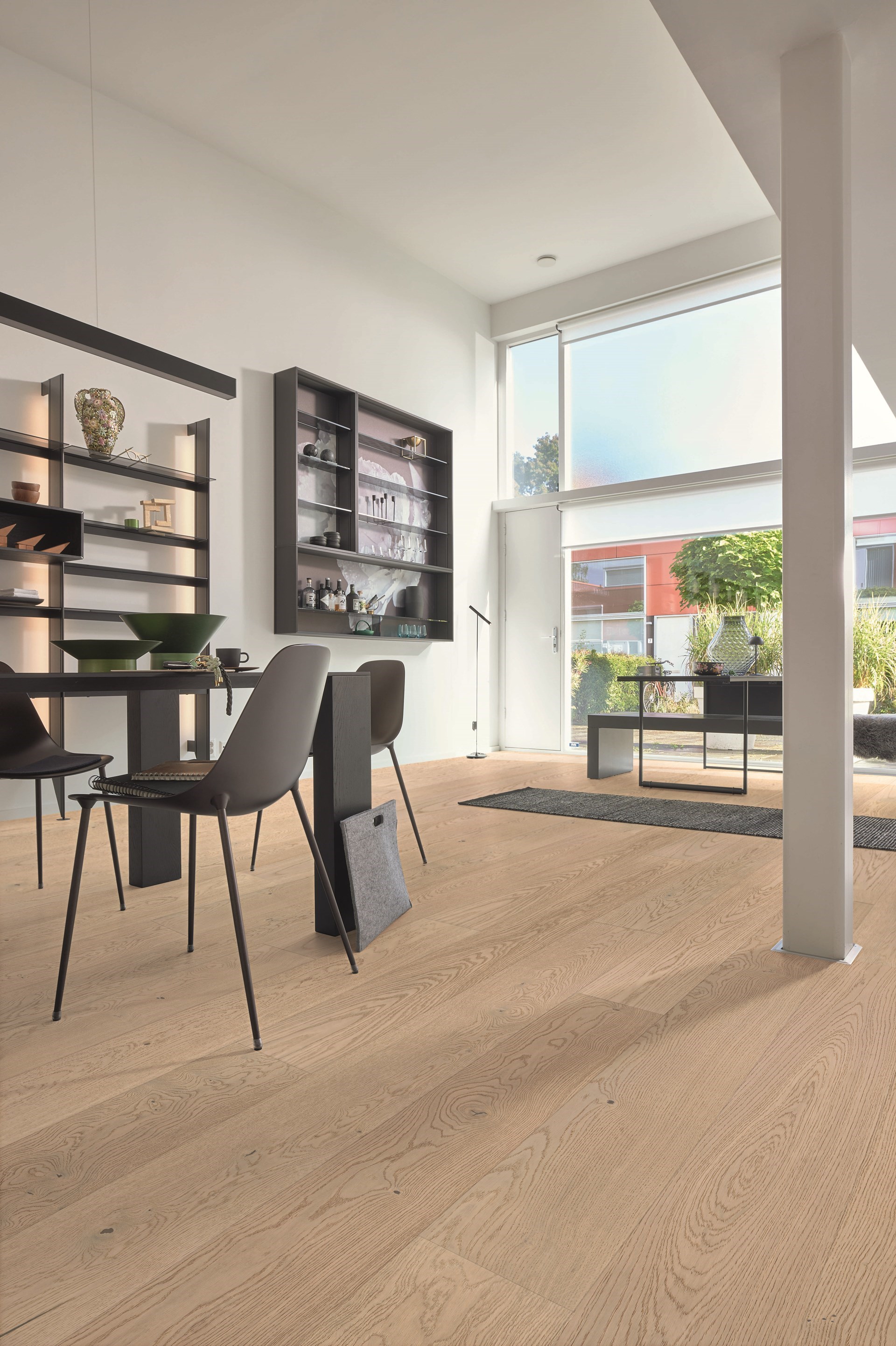 De highlight van het nieuwe laminaatassortiment is de Edition m8. De nieuwe laminaatcollectie van MEISTER maakt indruk met zeer natuurlijke, buitengewoon brede planken met een eindeloze look. Hoewel de plank eigenlijk een compact formaat heeft (1.288 x 328 mm), zijn de overgangen tussen de gelegde planken amper zichtbaar. Dus ontstaat zo de indruk van oneindig lange planken. Het authentiek matte decoroppervlak en de natuurlijke houtstructuur geven zichtbaar en voelbaar de indruk van een natuurgeoliede vloer van echt hout.