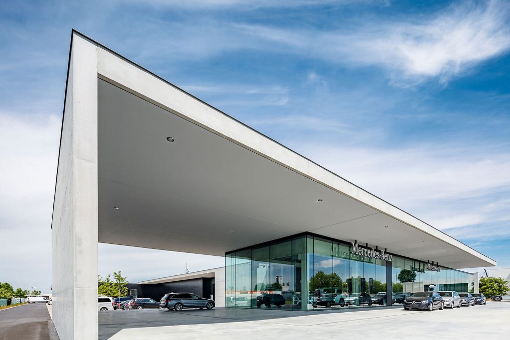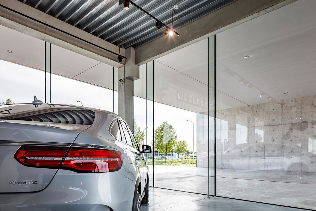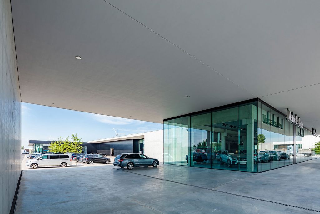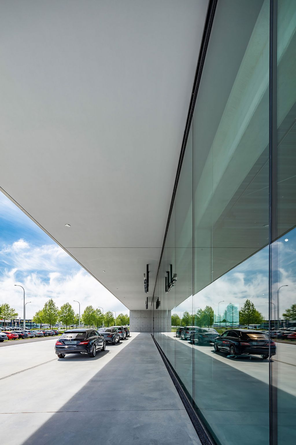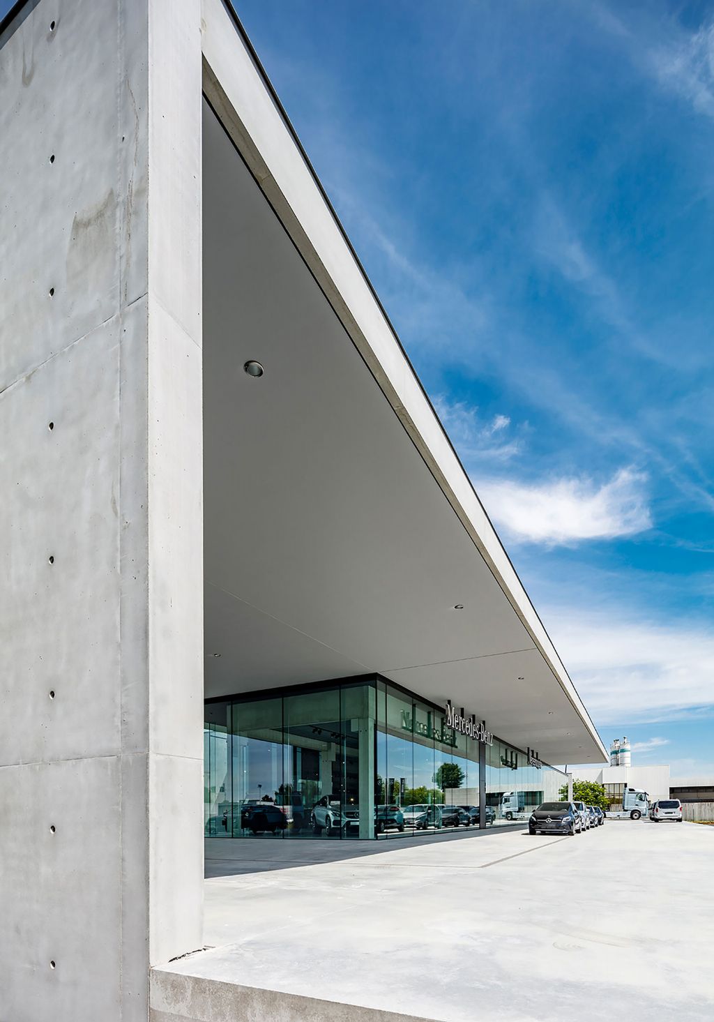 Van op de nabijgelegen stadsring worden alle blikken meteen aangezogen door de sterrenshow op de verhoogde catwalk. De wagens staan veilig beschut onder een strak gelijnde luifel, waarvan het plafond quasi naadloos en rigoureus vlak is afgewerkt met Knauf Aquapanel. In eenzelfde beweging herschikten de jongleur-ontwerpers de rommelige buitenruimte tot een transparant geheel en gaven ze de bestaande en nieuwe gebouwen een visuele coherentie.