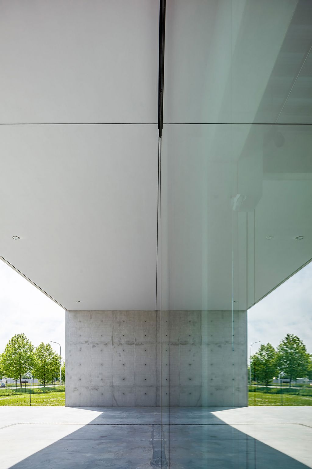 Als derde krachtlijn komt de grote luifel pertinent in beeld. “Door de betonwanden oordeelkundig in te planten, konden we bovenop twee daarvan de luifel plaatsen, zodat hij lijkt te zweven. Dat geeft de minimalistische vormgeving een nog luchtiger en ijler karakter. In nauwe samenspraak met de ingenieur hebben wij de luifel zo uitgekiend dat de hoogte minimaal bleef.