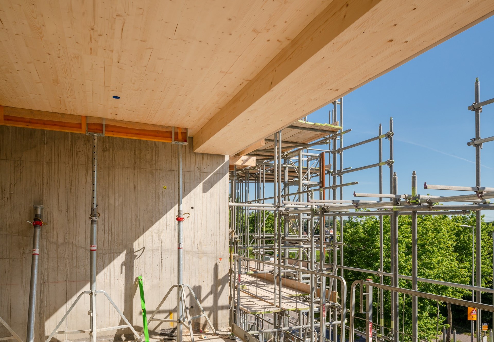 Een andere factor was het uiteenlopende zettingsgedrag van de verschillende materialen: hout, ter plaatse gestort beton en geprefabriceerde betonnen elementen. De slanke constructie had gevolgen voor de stijfheid en verdraaiing van het gebouw. Ook voor driehoekige geprefabriceerde CLT-elementen die voor het trapeziumvormige grondvlak nodig waren, moest een oplossing worden gevonden. Hier waren onder andere het verloop van de wapening en de lastoverdacht bepalend. De lastoverdracht was ook bij de uitkragingen een punt van aandacht. Door het stalen zwaardhout, het lichte beton en het gevelelement van vezelbeton worden de balkons sterk belast. Daarvoor moest een oplossing worden bedacht die qua bouwfysica klopte.