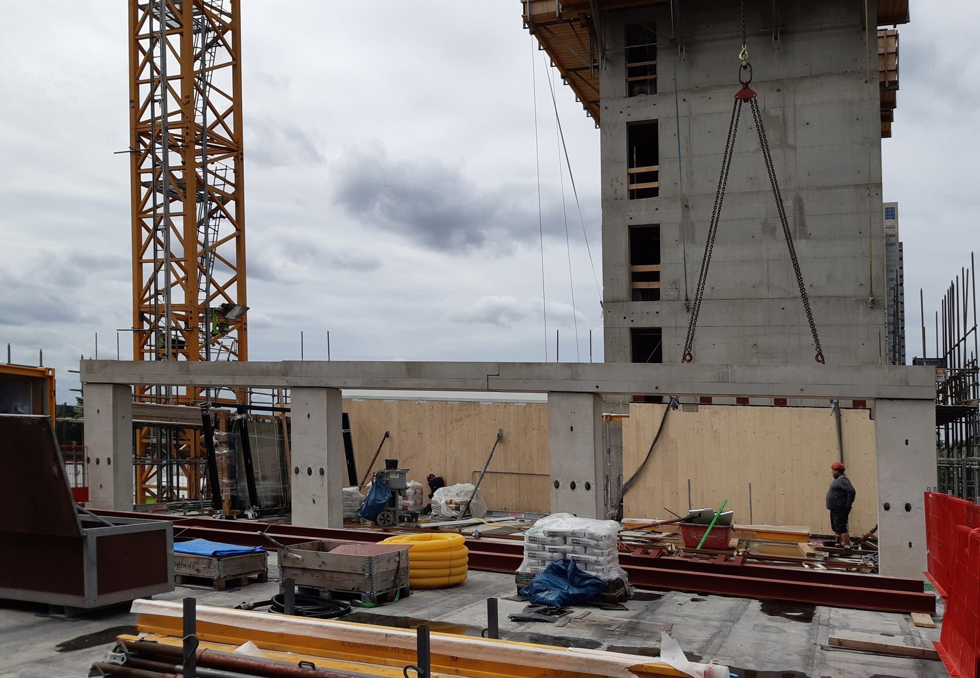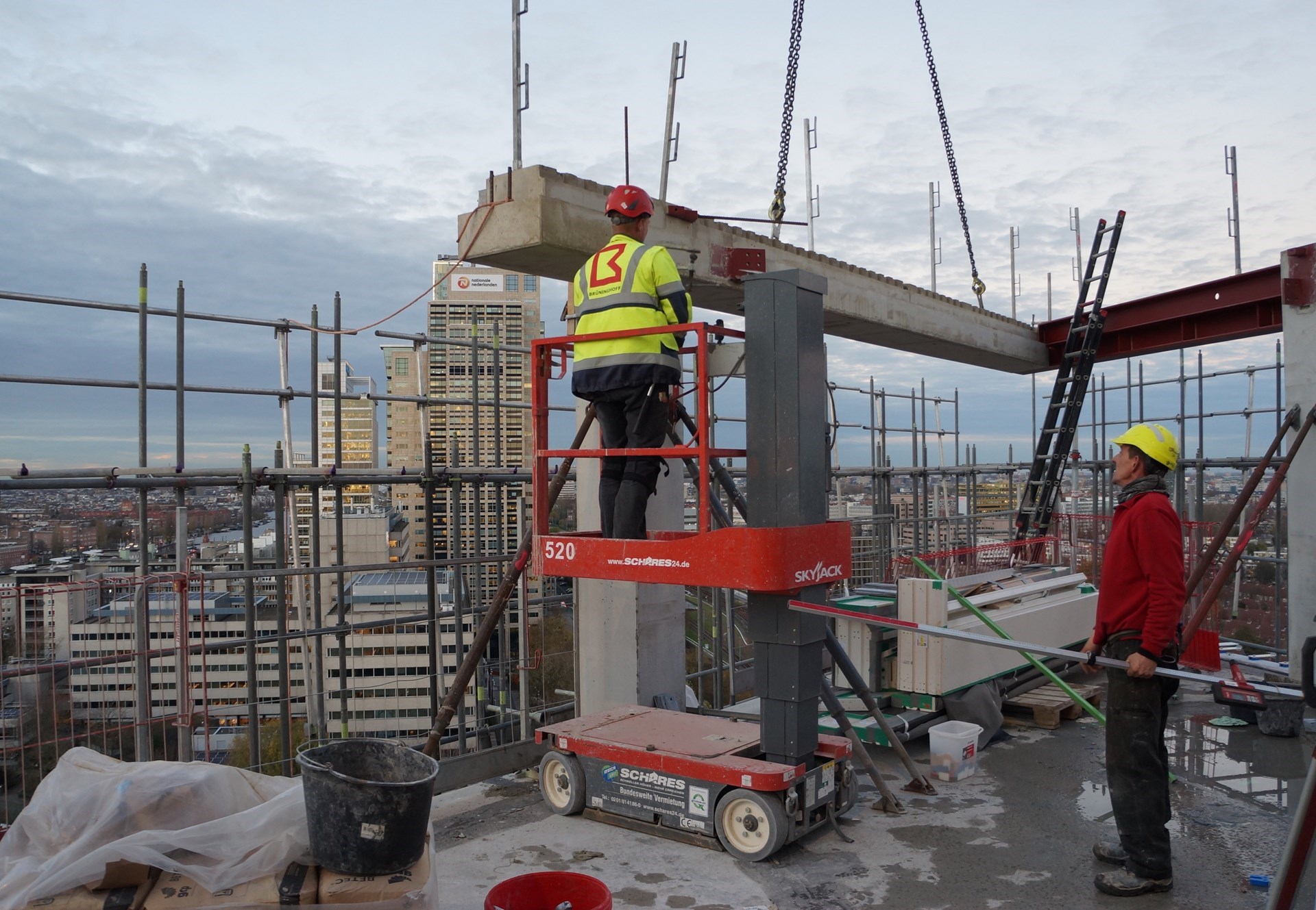 De CLT-plafondelementen zijn in de fabriek gemaakt. Op de bouwplaats zijn de afzonderlijke elementen vervolgens samengevoegd. Dit houdt onder andere in dat de voegen zijn dichtgeschroefd, gewapend, gegoten en afgedicht. De afzonderlijke CLT-plafondelementen zijn met wapening in de voegen met elkaar verbonden. In de voegen van de elementen is daarna ter plaatse beton gestort. Verder is een verbinding gerealiseerd met aangrenzende bouwelementen zoals wanden, pilaren en balken. “De plafondelementen zijn met stalen hoekankers aan het trappenhuis van sterk gewapend beton bevestigd. Deze zijn met deuvels aan de constructie bevestigd. De balken van het CLT-plafond zijn vervolgens weer aan deze hoekankers gehangen”, legt Thomas Kötte, bouwcoördinator bij Brüninghoff, uit. “De zeer hoge horizontale krachten worden hierbij via een vertanding en ingeschroefde versterkingen overgedragen.” Het was met uitzondering van de 21e verdieping niet nodig om de plafonds direct op de liftschacht aan te laten sluiten, omdat de liftschacht in het trappenhuis zit.