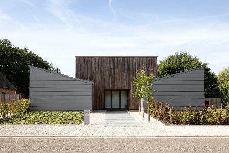De bewoners wensten uitdrukkelijk om de volumes voor het nacht- en daggedeelte daadwerkelijk als grote, afzonderlijke delen te percipiëren. Daardoor kwam het gebruik van zink in beeld. Zink is immers een materiaal dat als afwerking zowel op het dak als de gevel geplaatst kan worden en zo twee grote, gelijke delen kon vormen. Als extra accent werd gekozen om het derde, verbindende gedeelte, namelijk de inkom annex logeerkamer, te bekleden met thermowoodbeuk. De typisch bruine kleur van beuk werkt verzachtend in combinatie met de zinken bekleding, zodat de hele constructie rust en kalmte uitstraalt.