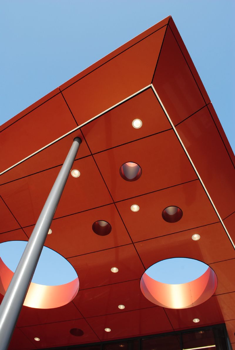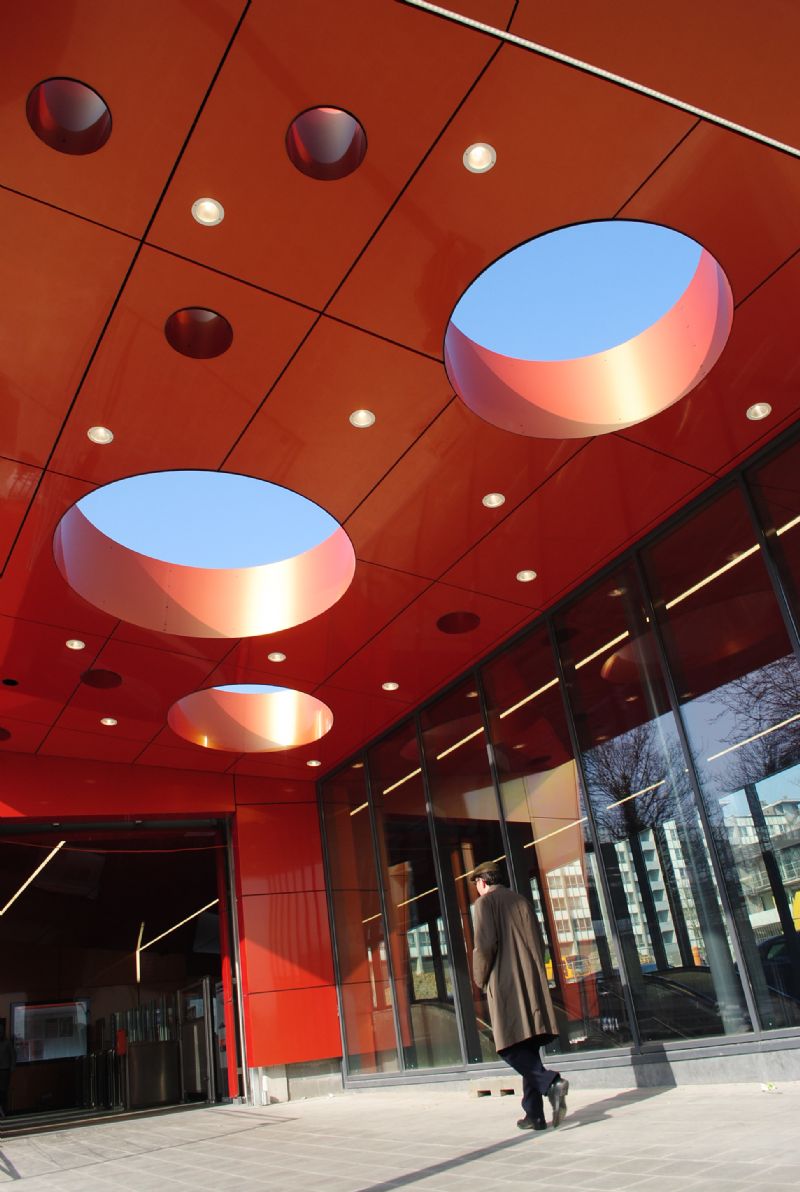 Naast het plafond en de wanden werd eveneens het schuinoplopend dak van een Alucobond cassettebekleding voorzien, met bijzondere aandacht naar waterdichting en regenwaterafvoer. De verschillende ronde dakopeningen waarvan de opstanden eveneens met Alucobond bekleed zijn, trekken de aandacht. Met de integratie van verschillende ledlijnen wordt ook ’s avonds de opmerkelijke vorm van dit gebouw in de kijker gezet.