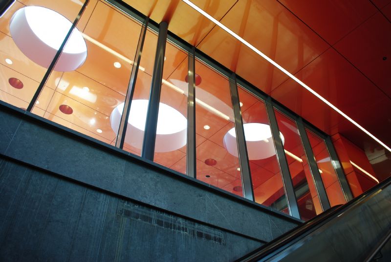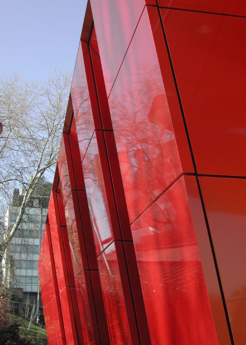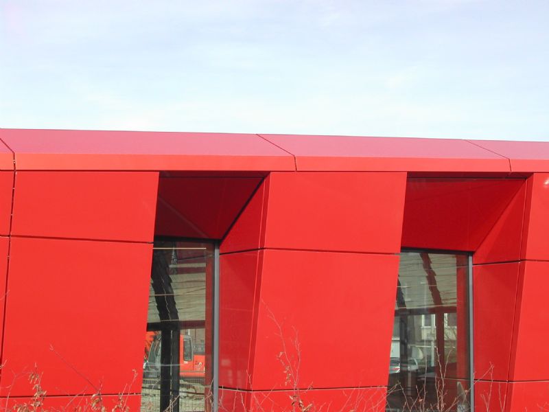 Binnen het gamma van Alucobond koos de architect voor CUPRAL 913. Dit is een kleur uit de Spectragroep, kleuren die veranderen afhankelijk van de kijkhoek. Cupral varieert van oranje tot rood. Ook de volledige binnenzijde van het gebouw is met Alucobond bekleed, daarom werd de onbrandbare Alucobond-A2 geplaatst.