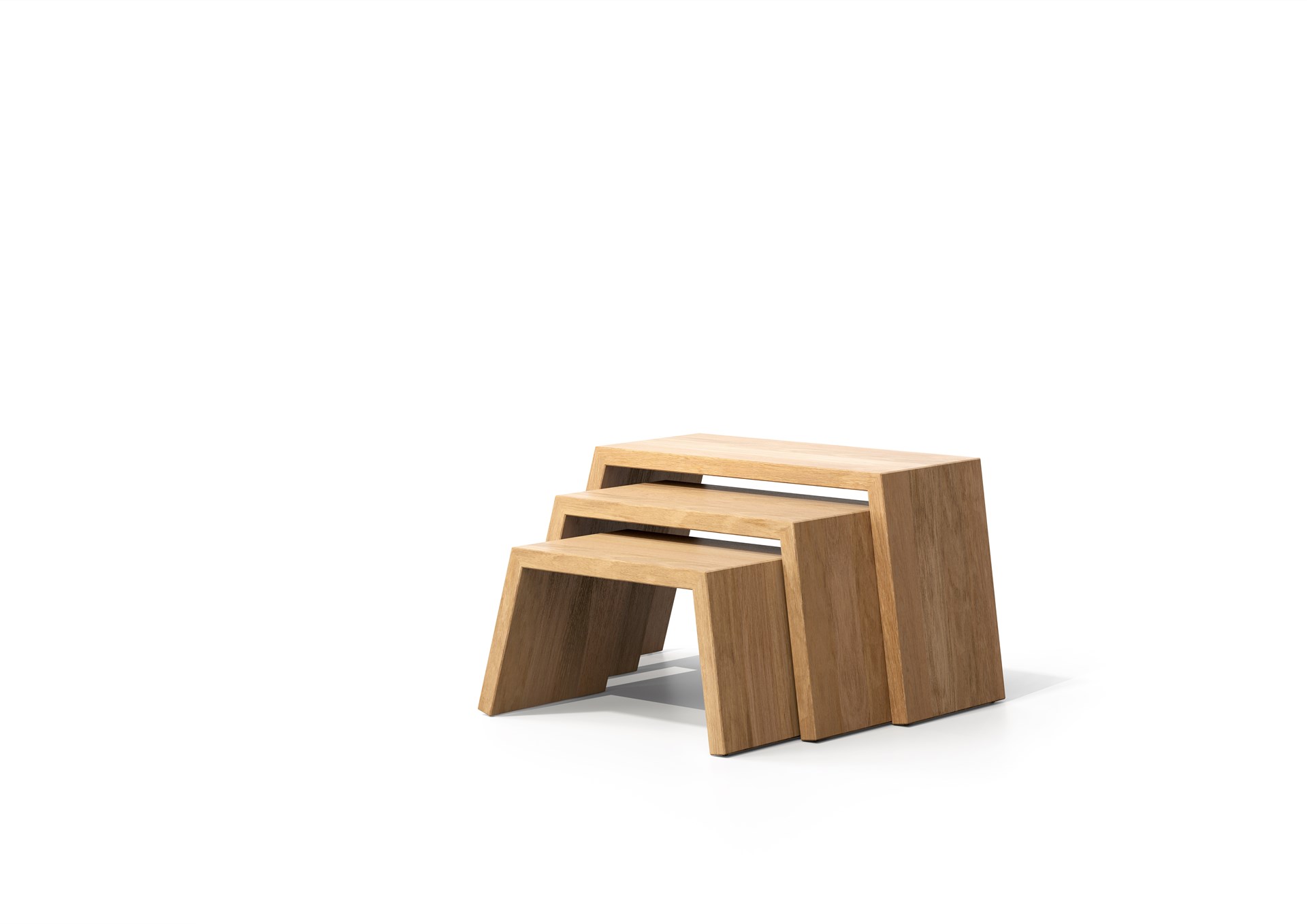 De meubelstukken, die je ook objecten zou kunnen noemen, zijn heel complementair met zowel de zitmeubelcollectie van INDERA als met de zuivere Casimir interieurlijn. Het zijn robuuste stukken in massieve eik die uitblinken in eenvoud en kwaliteit.