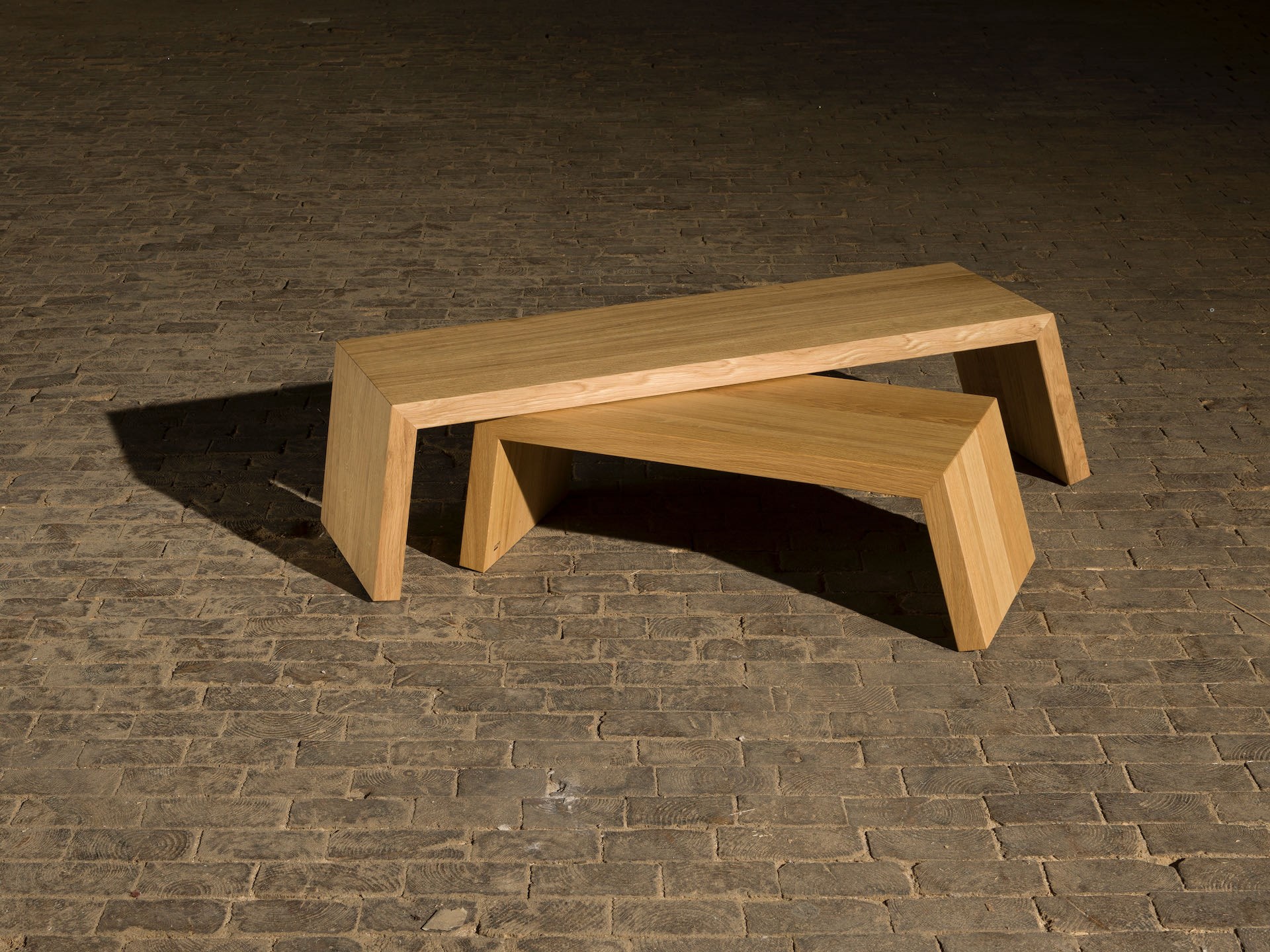 Casimir liet voor elk stuk een massief eiken plank omvouwen tot een meubel. Het zijn stuk voor stuk meubelklassiekers die we terugvinden in haast elk interieur - een tijdschrifthouder, een bijzettafel, een salontafel, een rekje - maar die door de vouwtechniek en zijn bijzonder boeiende vormen en een uitgekiend lijnenspel van de natuurlijke houtnerven een nieuwe dimensie krijgen.
