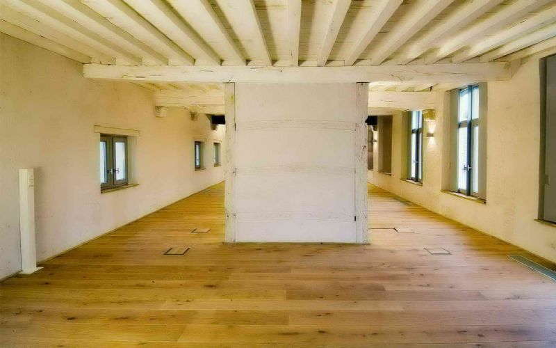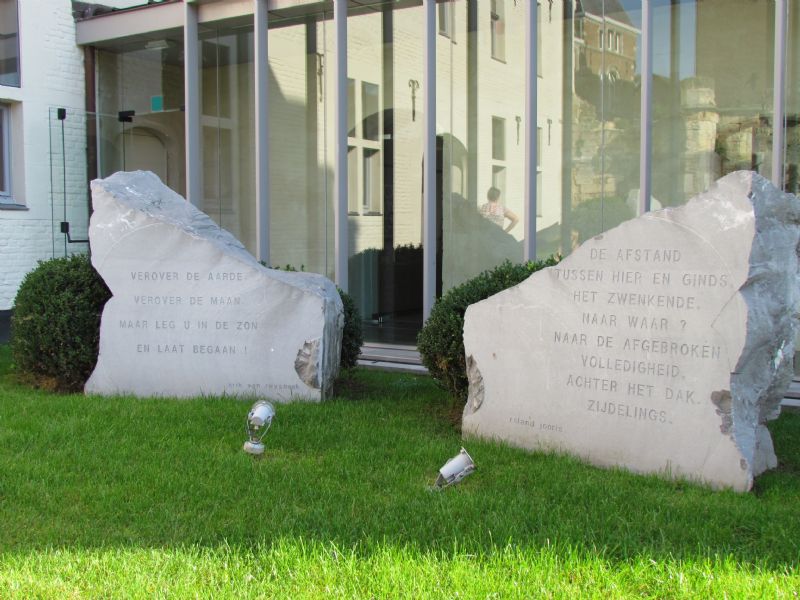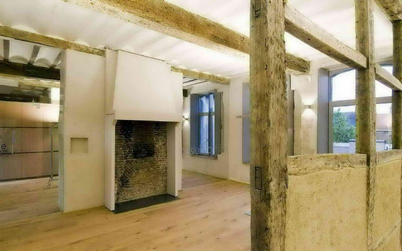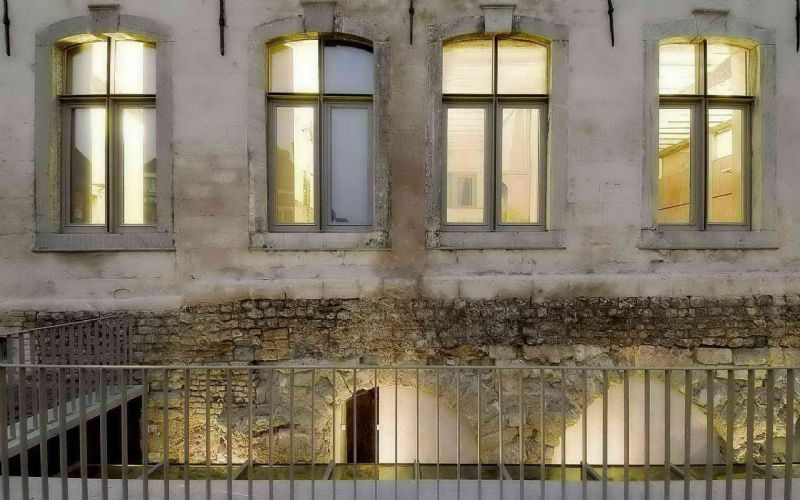 Het buitenschrijnwerk was volledig verdwenen en als nieuwe invulling heeft het ontwerpteam geopteerd voor strakke grijs geschilderde houten ramen met een fijne stalen voorzetkader die verwijst naar de originele raamverdeling. Bij voorafgaandelijke archeologische opgravingen waren de authentieke mergelstenen funderingsbogen van de middenvleugel vrijgelegd.
