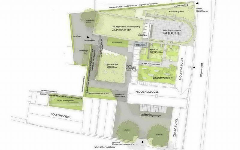 Tot slot moest het team de buitenruimtes en kapelruïne omvormen tot een publiek toegankelijk stadsparkje dat in dit dichtbebouwde stadsdeel een groene long vormt. Daarnaast moest het dienst doen als voetgangersdoorsteek tussen verschillende aangrenzende straten. In het bijzonder als passage op de toeristische wandelas tussen de Tongerse Grote Markt en met middeleeuwse begijnhof.