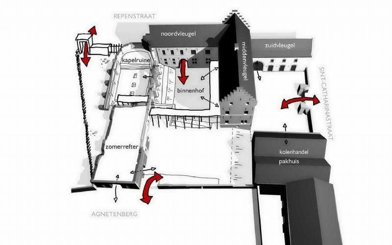 De buitenruimte bij het Agnetenklooster stond vroeger in nauwe relatie tot de gebouwen. Het betrof een aantal ruimtelijk afgebakende binnenpleinen die elk een eigen bestemming en karakter hadden. In het herbestemmingsproject zijn op eigentijdse wijze enkele verdwenen ruimtelijke begrenzingen hersteld en hebben de binnenpleinen opnieuw een eigen gelaat gekregen. Een opdracht die Buro voor Vrije ruimte voor zijn rekening nam.