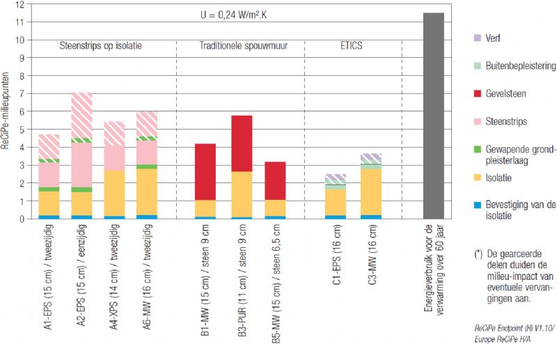 De grafiek op de volgende pagina geeft door middel van ReCiPe-milieupunten (zie www.lcia-recipe.net) de globale milieu-impact van de verschillende vergeleken buitengevelisolatiesystemen met een warmtedoorgangscoëfficiënt van 0,24 W/m².K weer en dit, in functie van hun opbouw. Hoe hoger de ReCiPe-waarde, hoe groter de milieu-impact.