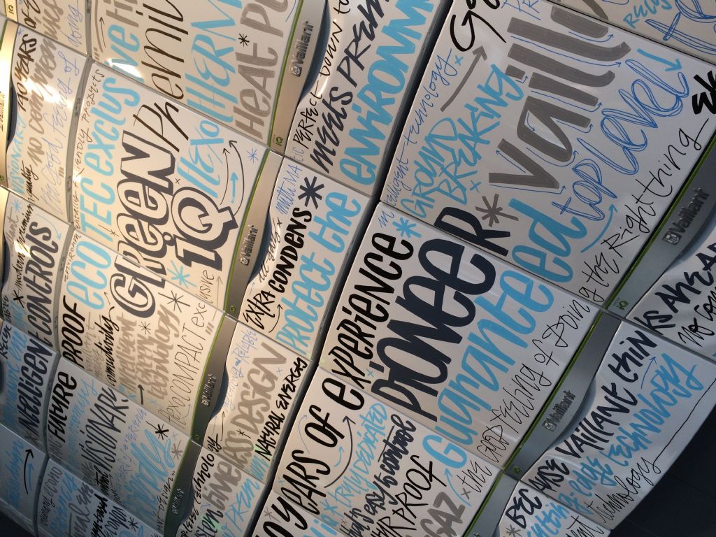 De Brusselse kunstenaar van Doornikse origine Denis Meyers maakte furore door de binnenkant van het oude Solvay-gebouw in Elsene vlak voor het aan de sloophamer ten prooi viel van onder tot boven vol te tekenen met grappige of pakkende opschriften. Datzelfde principe van creatie, ontmanteling en herbestemming - zij het wat kleinschaliger - is terug te vinden in het kunstwerk ‘Green iQ’ dat hij voor Vaillant creëerde. Voor ‘Green IQ’ voorzag Denis Meyers een muur van in totaal 27 frontpanelen van de milieuvriendelijke ecoTEC exclusive Green iQ condensatiegaswandketel van originele opschriften die verwijzen naar duurzaam energiegebruik.