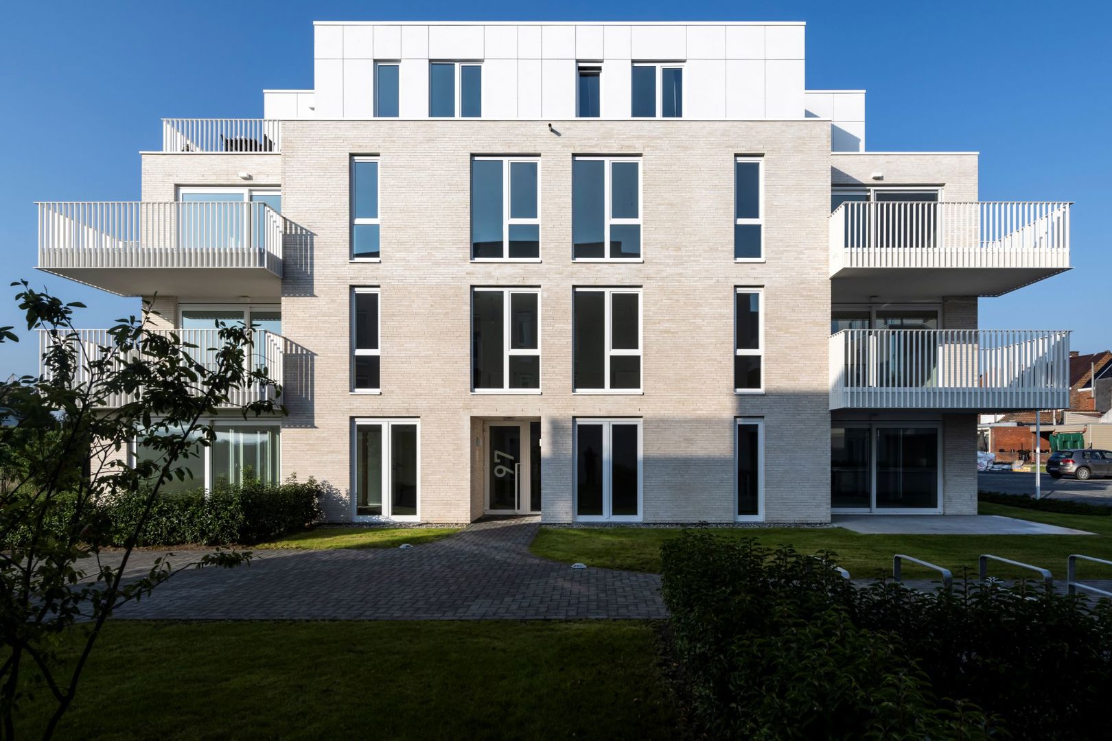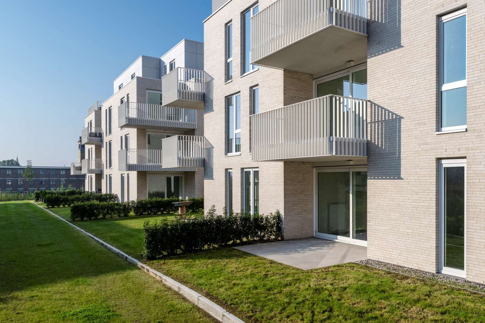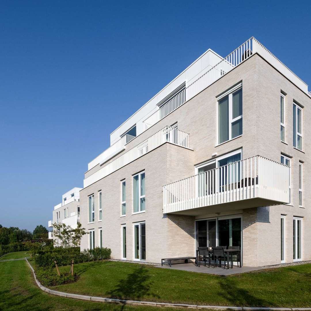 Bij het ontwerp werd sterk ingezet op afstemming met de bestaande wijk. De volumes tellen drie tot vier bouwlagen, en hun inplanting respecteert de schaal van de omgeving. De keuze voor lichte, sobere materialen en een heldere volumetrie zorgt voor een rustige uitstraling die tegelijk eigentijds en tijdloos is.