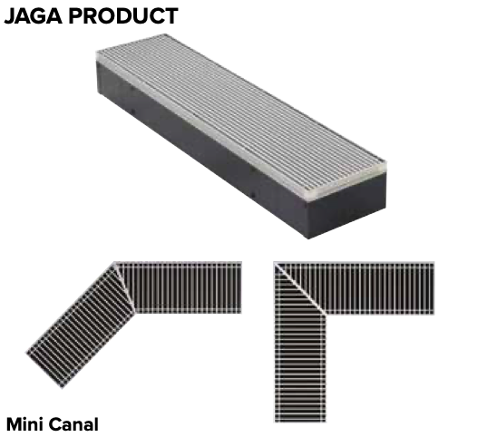 De Mini Canal is een vloerinbouwsysteem van Jaga dat wordt gekenmerkt door de onmiddellijke reactie die het heeft op eventuele temperatuurschommelingen en de Low-H2O technologie die de koolstofuitstoot met 10% terugdringt.