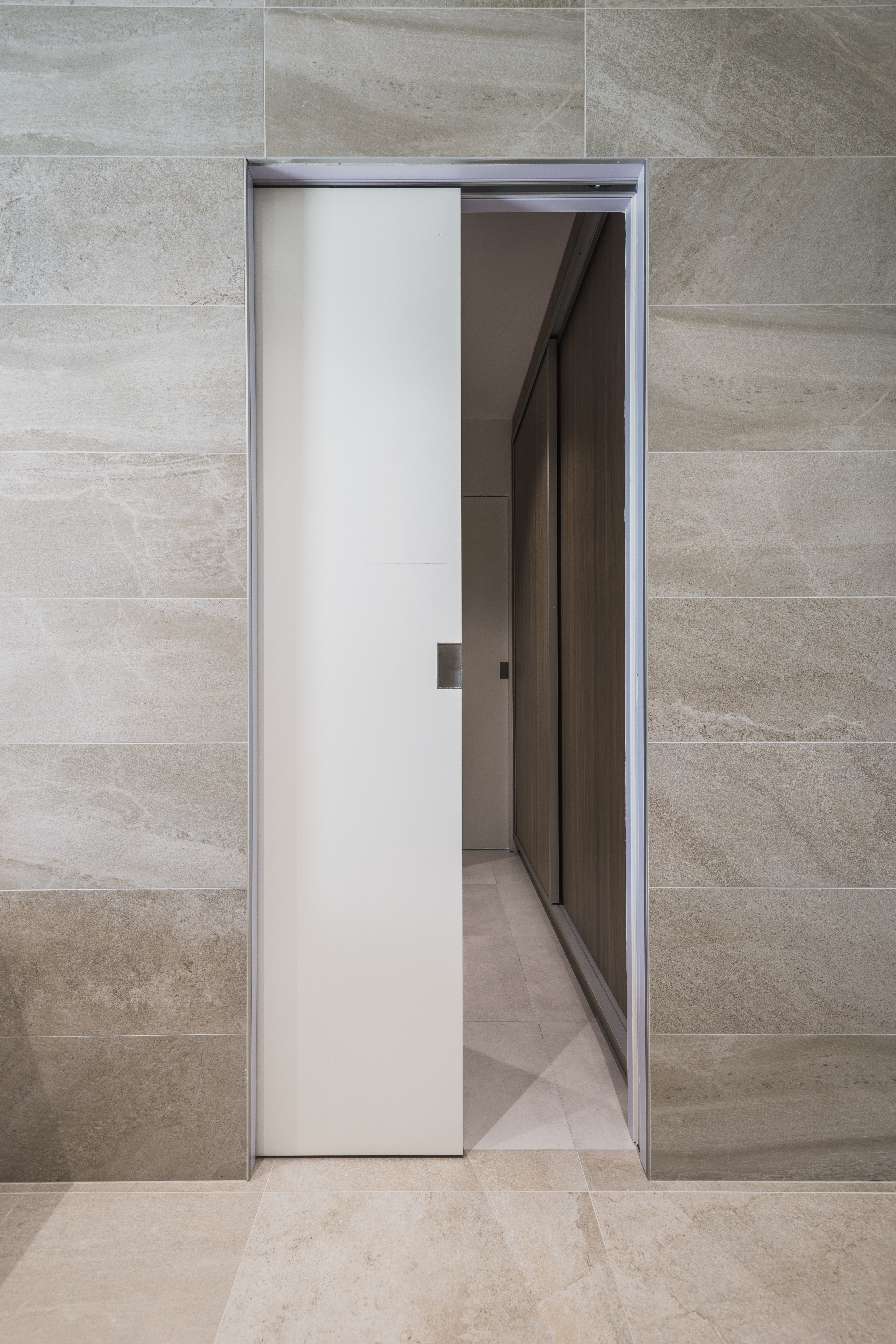 Bij ingewerkte deuren zoals die van argenta komt meer techniek en vakkennis kijken dan bij een klassieke binnendeur met kassement en omlijsting. De plaatsing van het aluminium deurkader, de Neo S5-scharnieren en het magneetslot is maatwerk en moet uiterst zorgvuldig gebeuren. De kaders moeten daarnaast zowel mechanisch bevestigd worden als met montageschuim. “Het onzichtbare aluminium kader wordt ingepleisterd zodat alle technieken aan het oog onttrokken zijn en de deur perfect in hetzelfde vlak als de wand ligt”, legt Jonathan De Sloover, commercieel medewerker bij Dierick Deuren, uit. “Gesloten deuren en wanden vormen op die manier één geheel. Van omlijstingen is geen sprake meer en scharnieren worden zo gemonteerd dat ze van buitenaf niet zichtbaar zijn.”