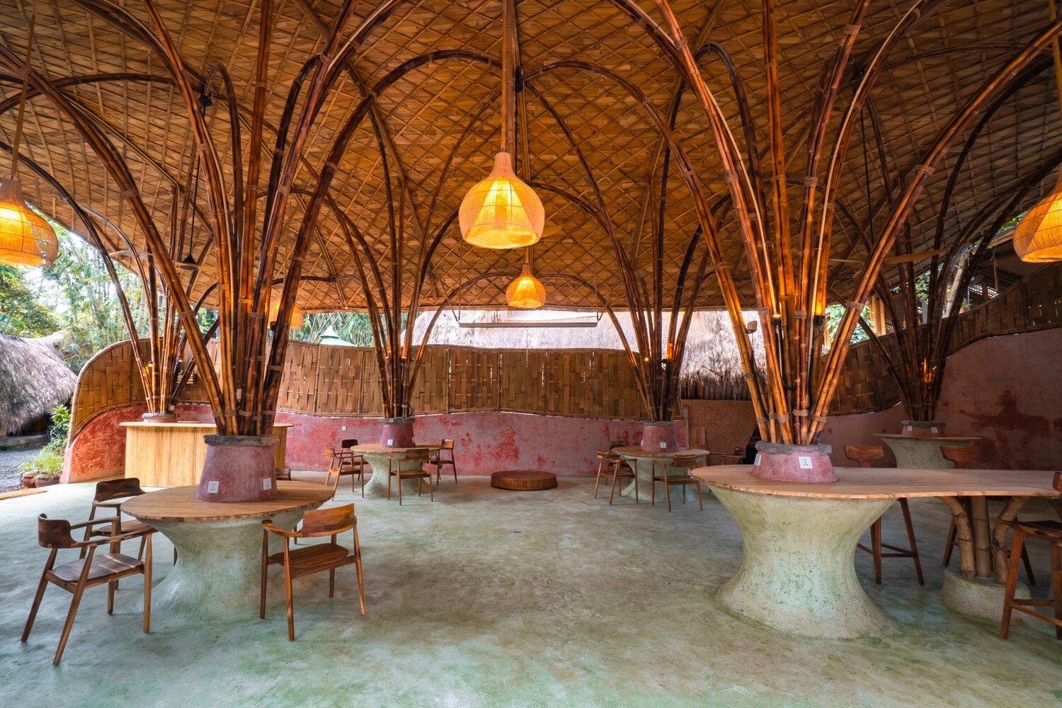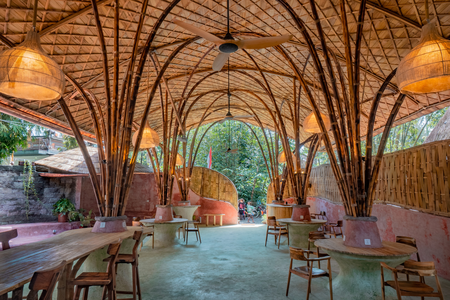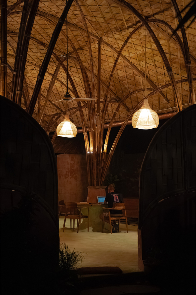 Het project sluit aan bij een campus vol baanbrekende bamboe-architectuur, waaronder The Arc, de gevierde sporthal van de Green School, bekend om haar innovatieve structurele ontwerp. Het duurzame materiaalpalet omvat terrazzo van gerecycled glas en biocomposiet, myceliumpanelen voor akoestiek, eco-crete bakstenen uit industriële as en kalkpleister die CO₂ opneemt tijdens het uitharden. Acht gebogen, met hitte gevormde pilaren ondersteunen een golvend bamboedak dat uitkraagt en bezoekers verwelkomt bij de ingang van de school. Dit dak is bekleed met het traditionele Indonesische Pelupuh-systeem van afgevlakte bamboeschindels.
