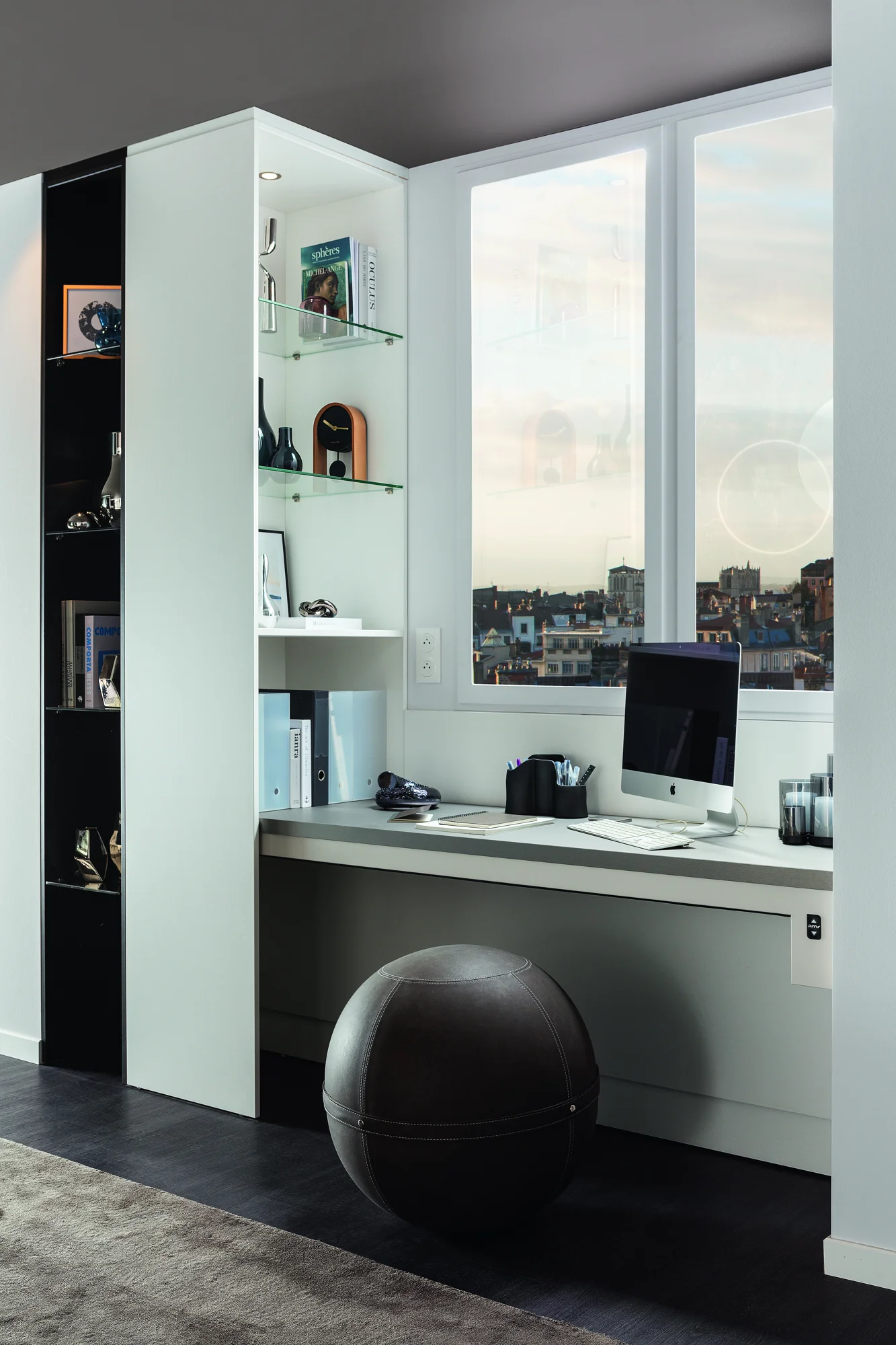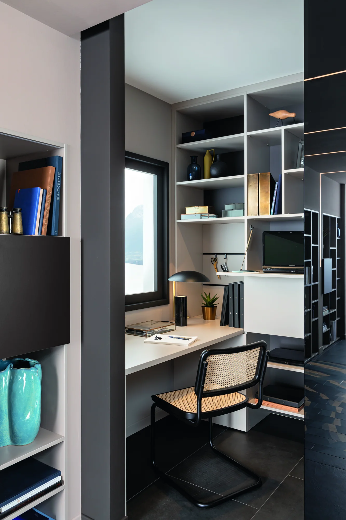 De commode is symmetrisch met een gemotoriseerd bureau, waardoor men naar wens staand of zittend kan werken. Elke ruimte wordt zo optimaal benut en heeft een specifieke functie.