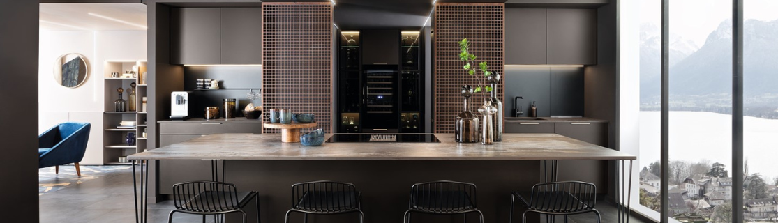 Deze sfeer onthult een stijlvolle en gestroomlijnde keuken die past in elk type woning en die geschikt is voor het ontvangen van gasten. De keukentoestellen zijn discreet weggewerkt in het meubilair. De degustatieruimte met wijnkast en het koekeiland vormen het hart van de keuken.