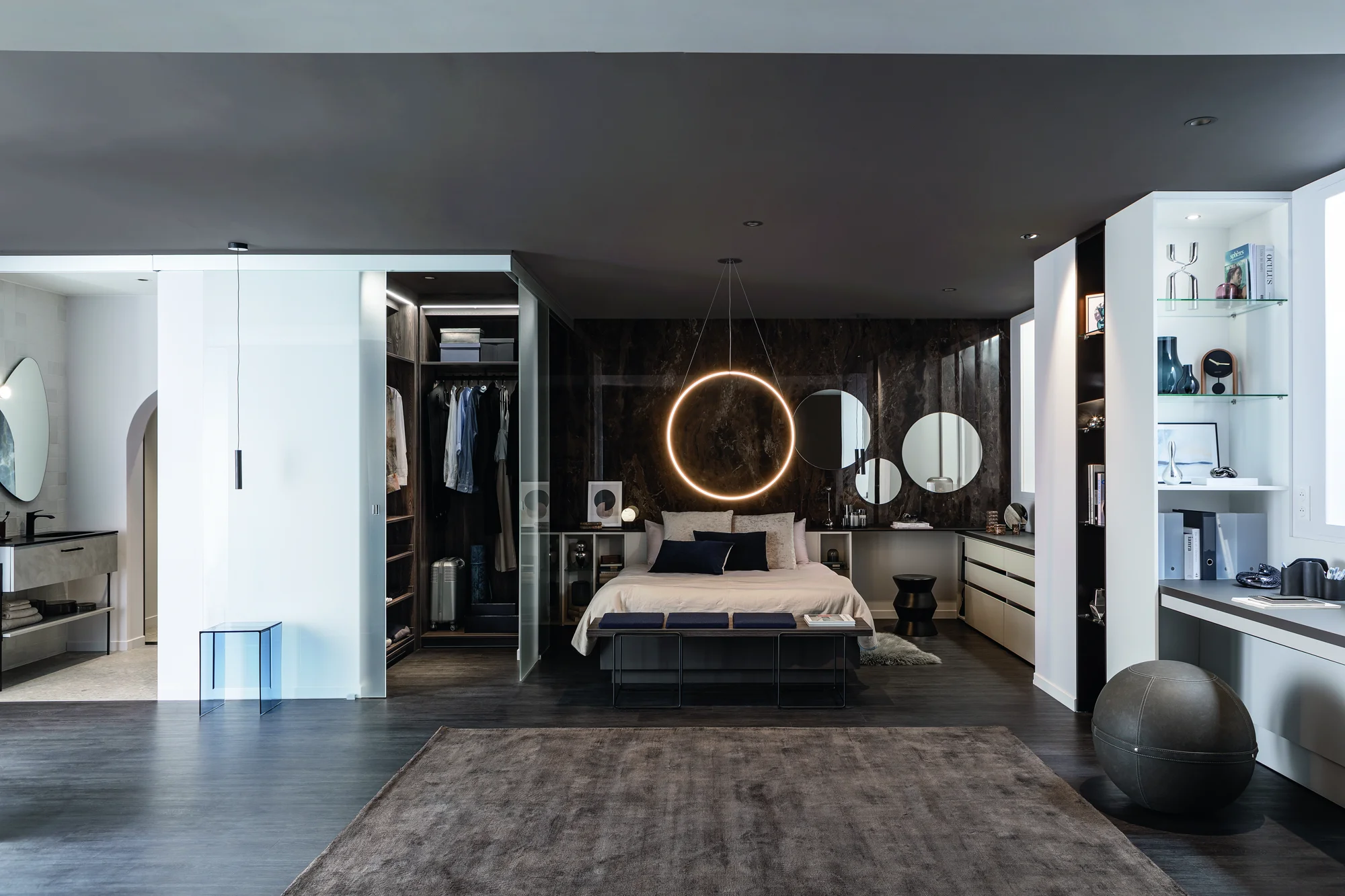 De slaapkamer heeft een warme en verfijnde look dankzij de mix van materialen en texturen. Bovendien is ze voorzien van een hoofdeinde met open elementen en een make-up tafel die doorloopt tot aan de commode. De dressing schuilt achter de doorschijnende schuifdeuren die het licht filteren en zorgen voor een intiemer gevoel.