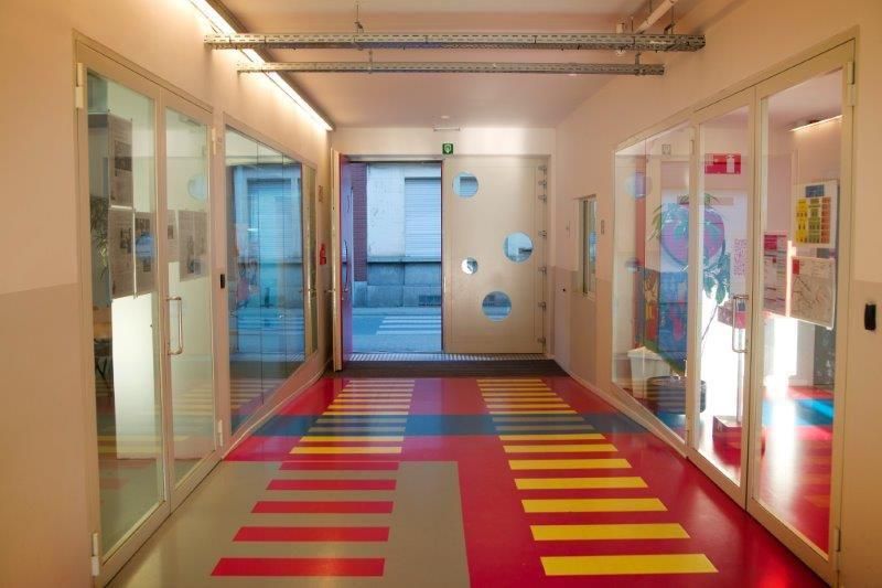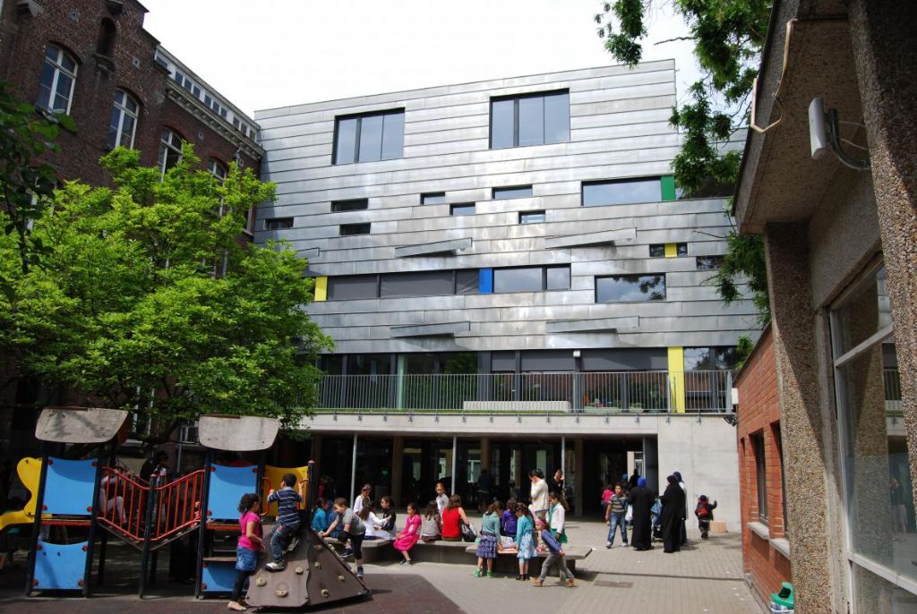 In het centrum van het lage deel van Sint-Jans-Molenbeek schermde dit gebouw de binnenplaats af van de Merchtemsesteenweg, waaraan de school is gelegen. Doelstelling was het gebouw te openen naar de publieke ruimte en de private ruimte van de school hiermee te laten communiceren. De binnenplaats werd visueel en fysiek toegankelijk gemaakt.