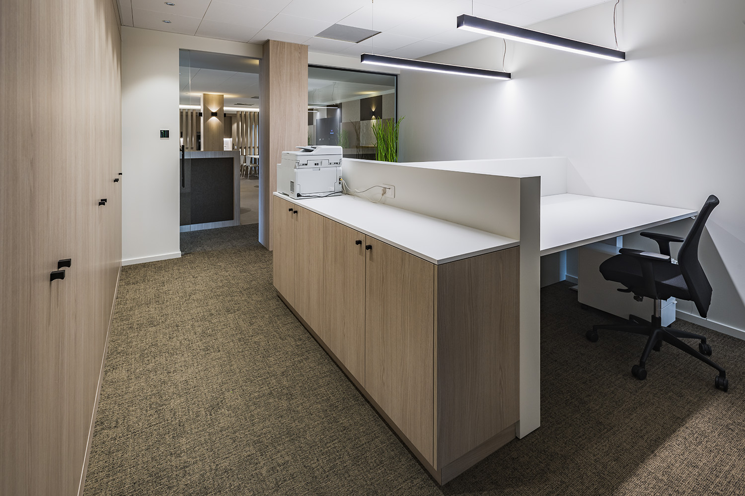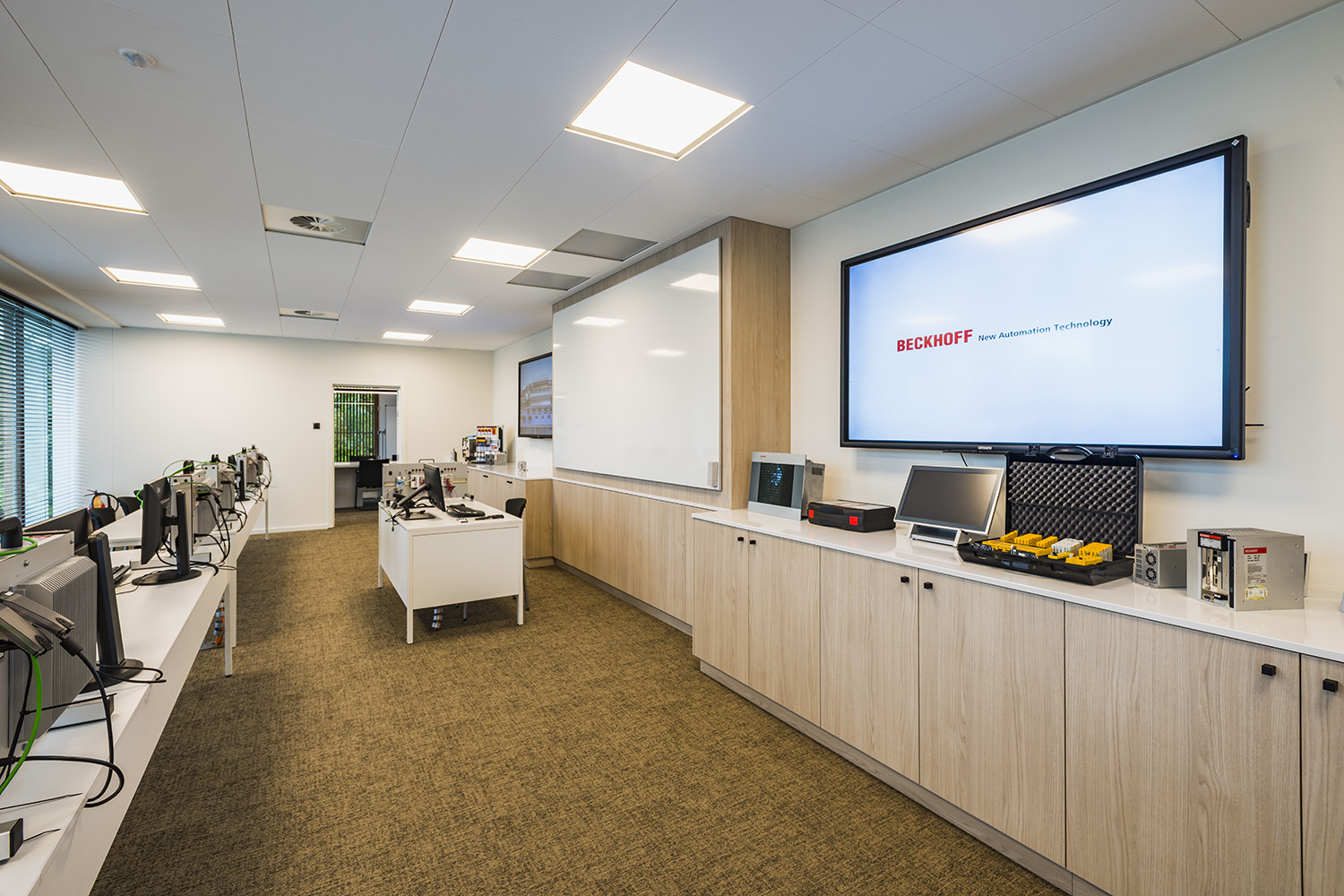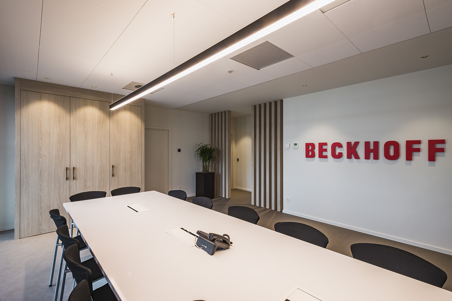 Het concept werd tot in de puntjes uitgewerkt. Het logo werd geïntegreerd in het interieur en er werd verlichting geplaatst boven de lamellen aan de voor- en zijgevel in Beckhoff-rood. “Wij opteren altijd voor een functioneel ontwerp en dat hebben we ook kunnen verwezenlijken in dit project. Werknemers kunnen gescheiden werken, maar er is toch een vorm van visueel contact via de doorzichtige wanden. We zorgde voor een rustige omgeving met een minimale hoeveelheid aan afleidingen,” vertelt Jaak Langenberg, mede-uitbater van Montagna Lunga.
