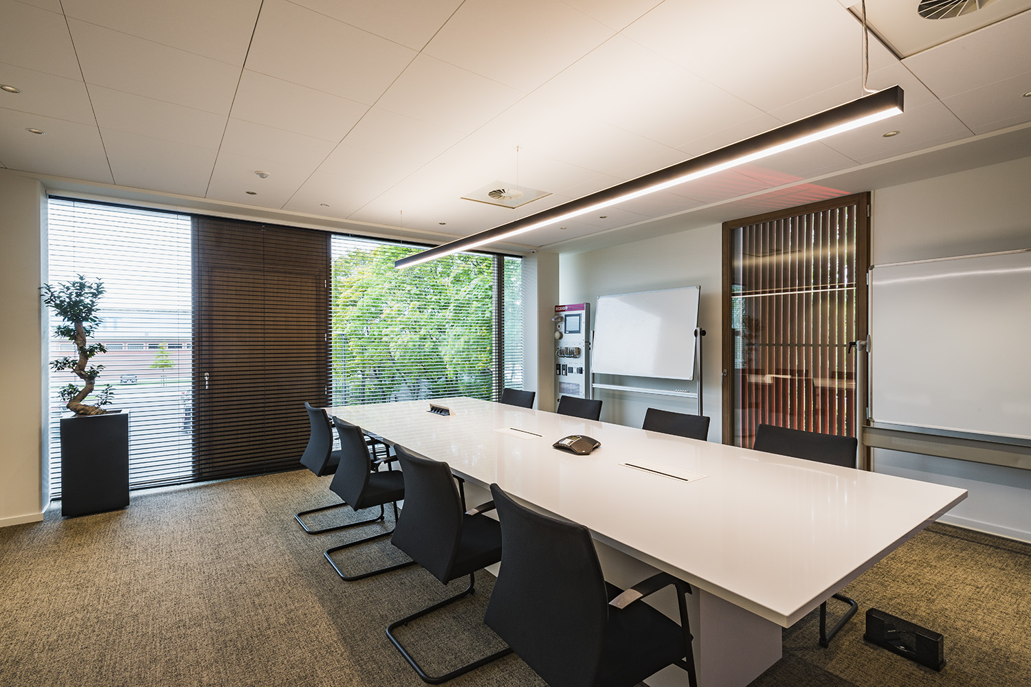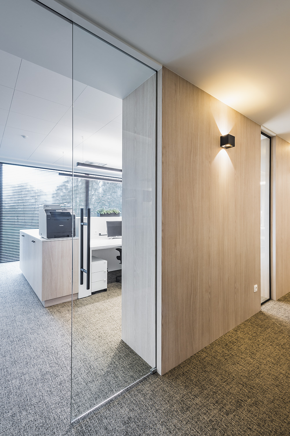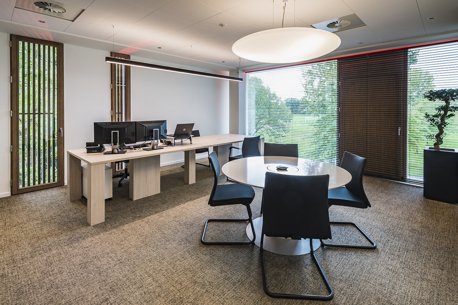 Het concept werd tot in de puntjes uitgewerkt. Het logo werd geïntegreerd in het interieur en er werd verlichting geplaatst boven de lamellen aan de voor- en zijgevel in Beckhoff-rood. “Wij opteren altijd voor een functioneel ontwerp en dat hebben we ook kunnen verwezenlijken in dit project. Werknemers kunnen gescheiden werken, maar er is toch een vorm van visueel contact via de doorzichtige wanden. We zorgde voor een rustige omgeving met een minimale hoeveelheid aan afleidingen,” vertelt Jaak Langenberg, mede-uitbater van Montagna Lunga.