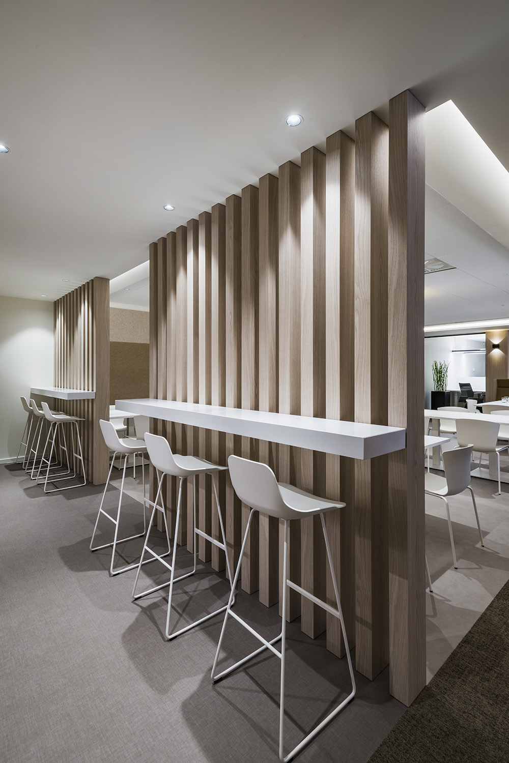 De enige projecteisen die de opdrachtgever oplegde, waren de ruimtelijke indeling, een goede akoestiek en de verwerking van het logo in het kantoorinterieur. Montagna Lunga koppelde die functionele vraag aan een sfeer en een stilistische invulling.