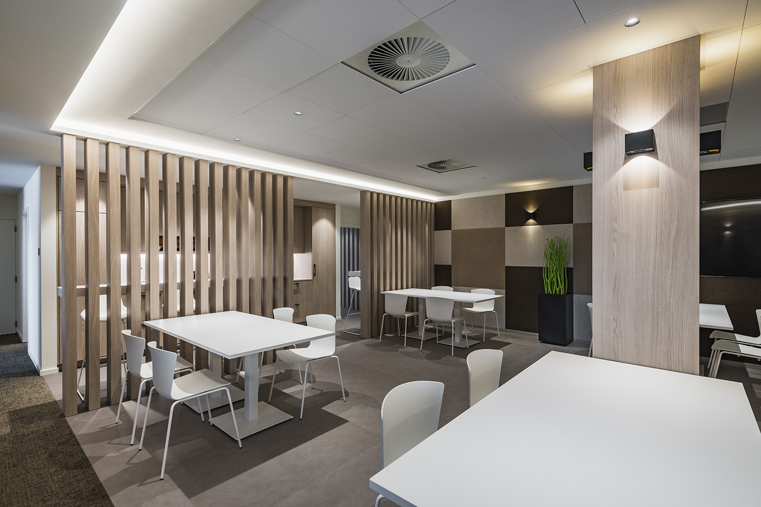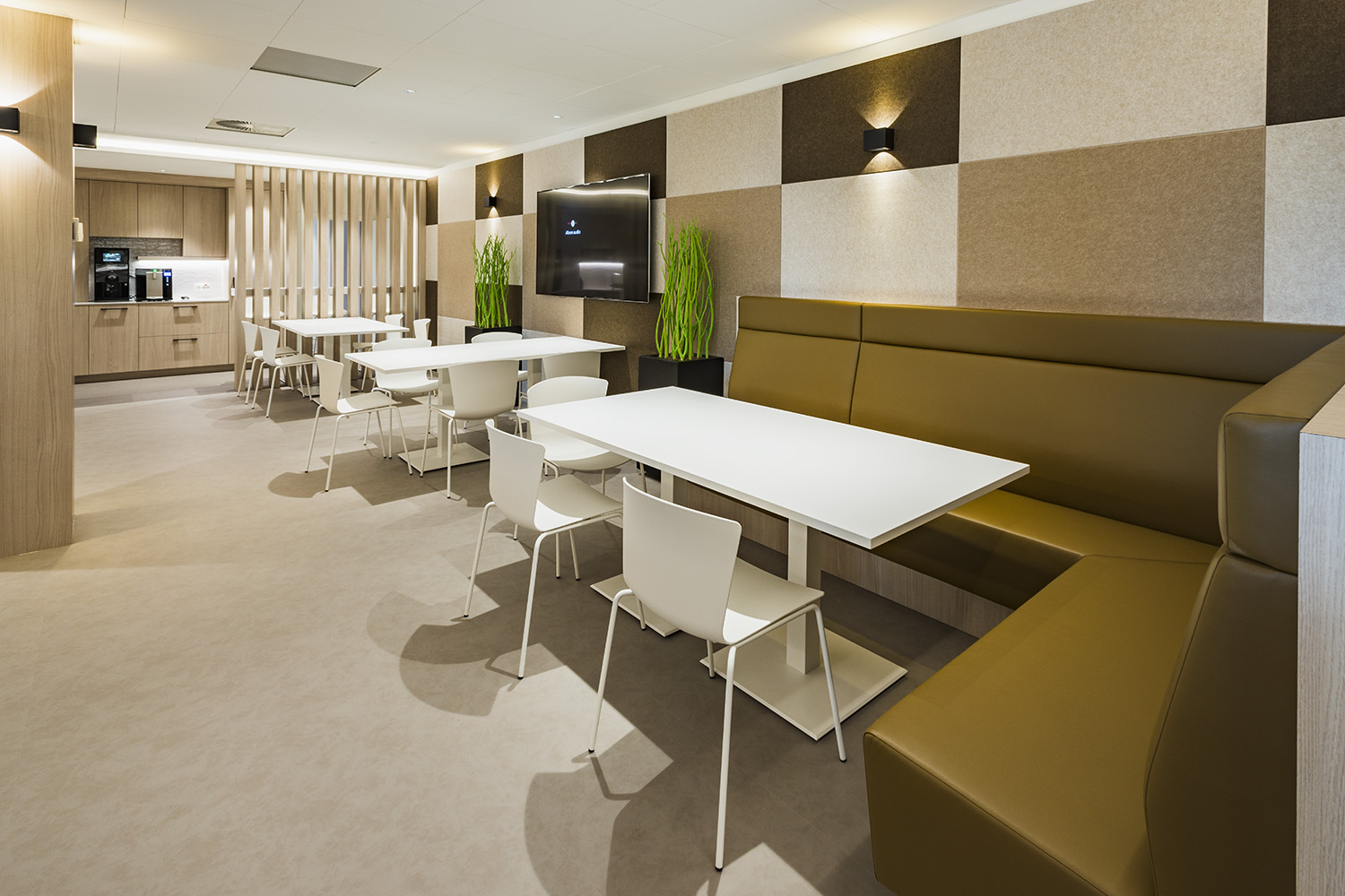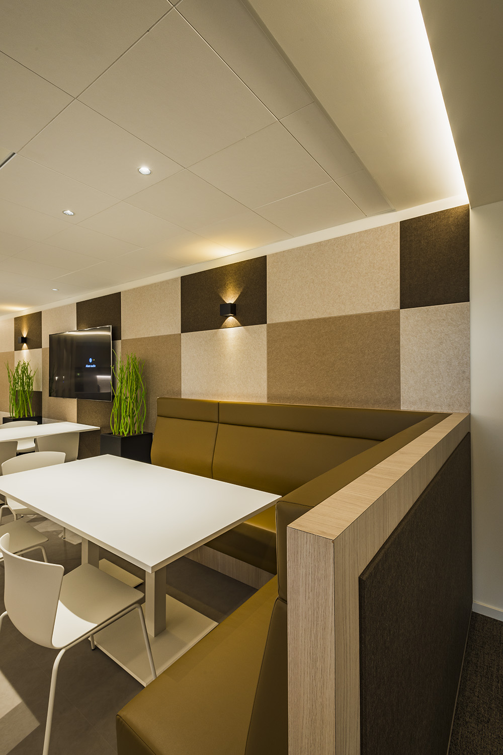 Een ingetogen kleurenpallet zorgt, in combinatie met andere interieuraspecten, voor een rustige en huiselijke sfeer. Een bewuste keuze die de productiviteit van het personeel dient te verhogen. Deze rust komt ook terug in de keuzes die werden gemaakt op het gebied van akoestiek en ruimtelijke indeling. De vloerbekleding bestaat uit verschillende elementen: doorheen het kantoor wordt een combinatie gemaakt tussen Rockfon-panelen, Gyproc, iD Square vinyltegels en Desso-tappijttegels van Tarkett. Dit duurzaam, maar mooi design met een geluidsreductie van 15 dB, zorgt ervoor dat er in het gehele kantoor efficiënt gewerkt kan worden zonder storende omgevingsgeluiden. Er werd ook overal akoestische muurbekleding geplaatst (In-Felt).