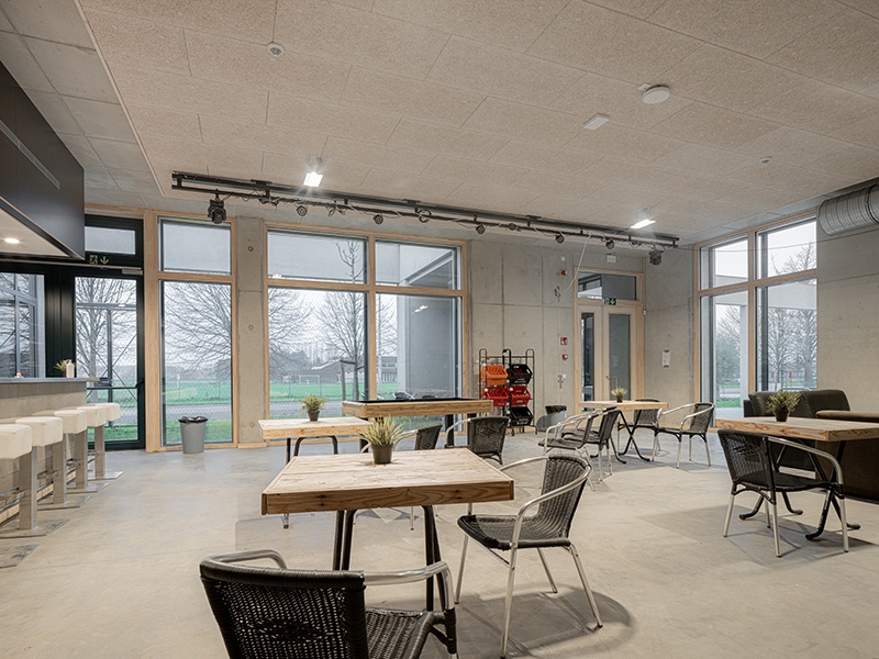 Zo wordt er een algemeen verlaagd geluidsabsorberend plafond voorzien uit houtvezelcementplaten en worden de wanden afgewerkt met houten latten met een achterliggend spouw die wordt opgevuld met minerale wol.