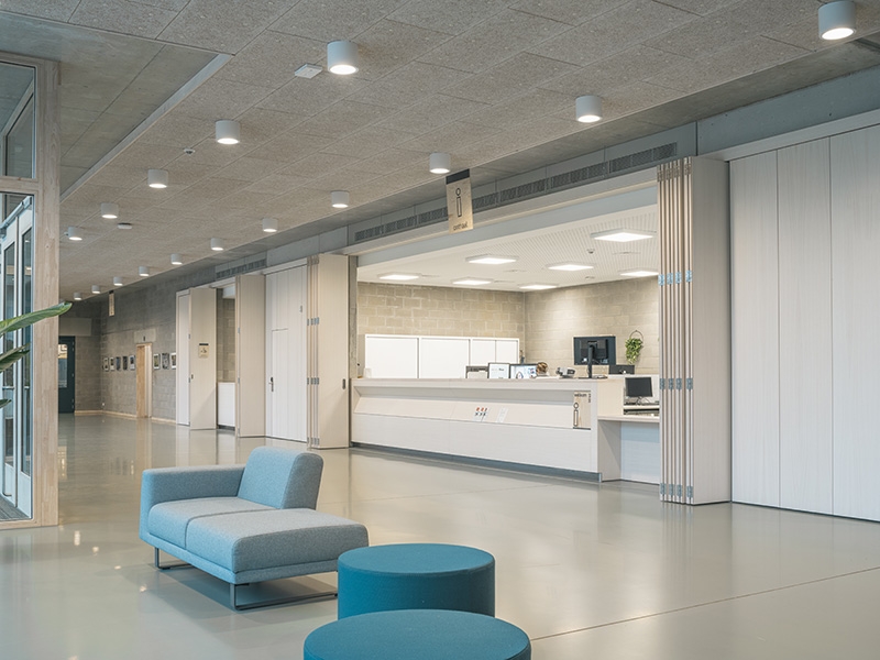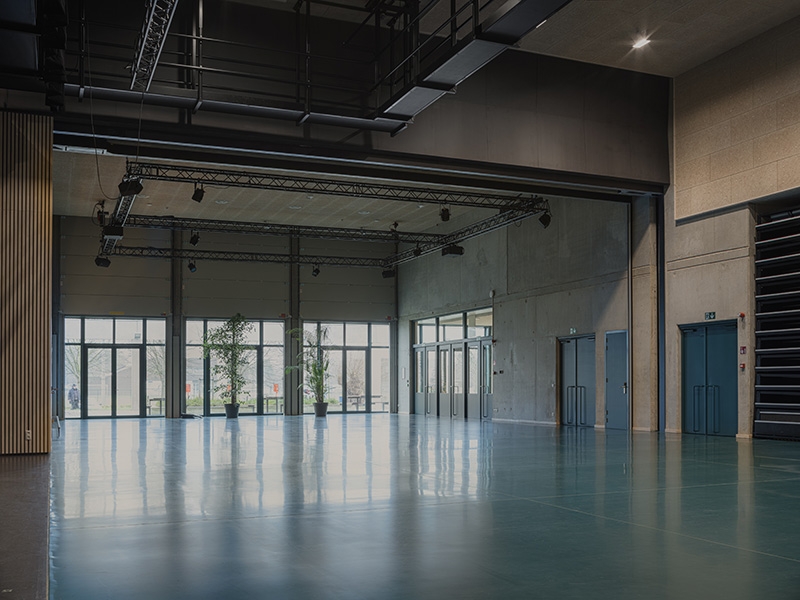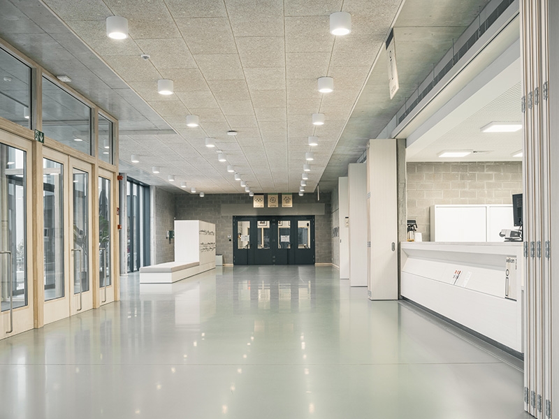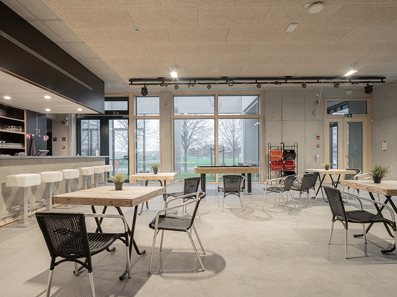 Een wens van de opdrachtgever was om in de foyer veel daglicht en voldoende contact met de buitenomgeving te hebben. Dit wordt verenigd met de hoge eisen aan geluidsisolatie naar de omgeving door het voorzien van geluidsisolerende sectionaalpoorten die voor de beglaasde gevel van de foyer worden geschoven. Op deze manier is er bij optredens of fuiven geen geluidoverlast naar de omgeving, maar blijft er een aangenaam contact met de buitenomgeving bij het normaal gebruik van de foyer als ontmoetingsruimte.