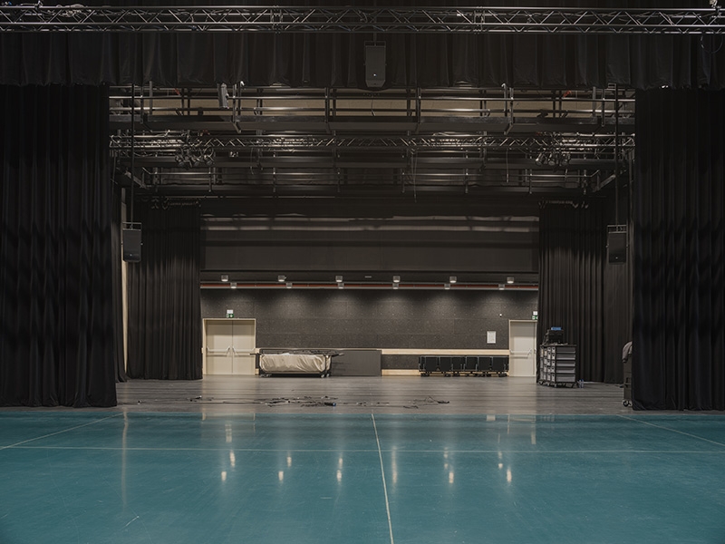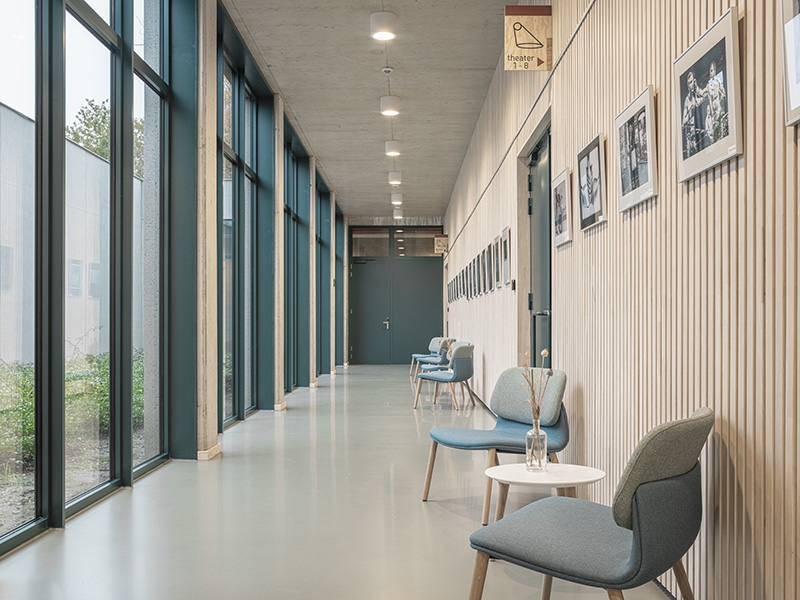 Doorheen het project werden de nodige geluidsabsorberende afwerkingen voorzien om een gepaste nagalmtijd te hebben in de theaterzaal en om rumoer te beperken in de ruimtes met hoge bezetting.