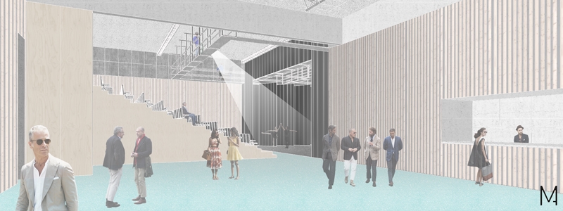 In het wedstrijdontwerp werden de theaterzaal en foyer gescheiden door een dubbele verschuifbare wand zodat beiden ruimten samen gebruikt kunnen worden voor feesten, eetfestijnen, etc. maar ook apart gebruikt kunnen worden voor theatervoorstellingen en recepties. De dubbele wand zorgt voor een voldoende geluidsisolatie tussen beiden zalen, zodat ze gelijktijdig en onafhankelijk van elkaar kunnen functioneren zonder elkaar te storen.